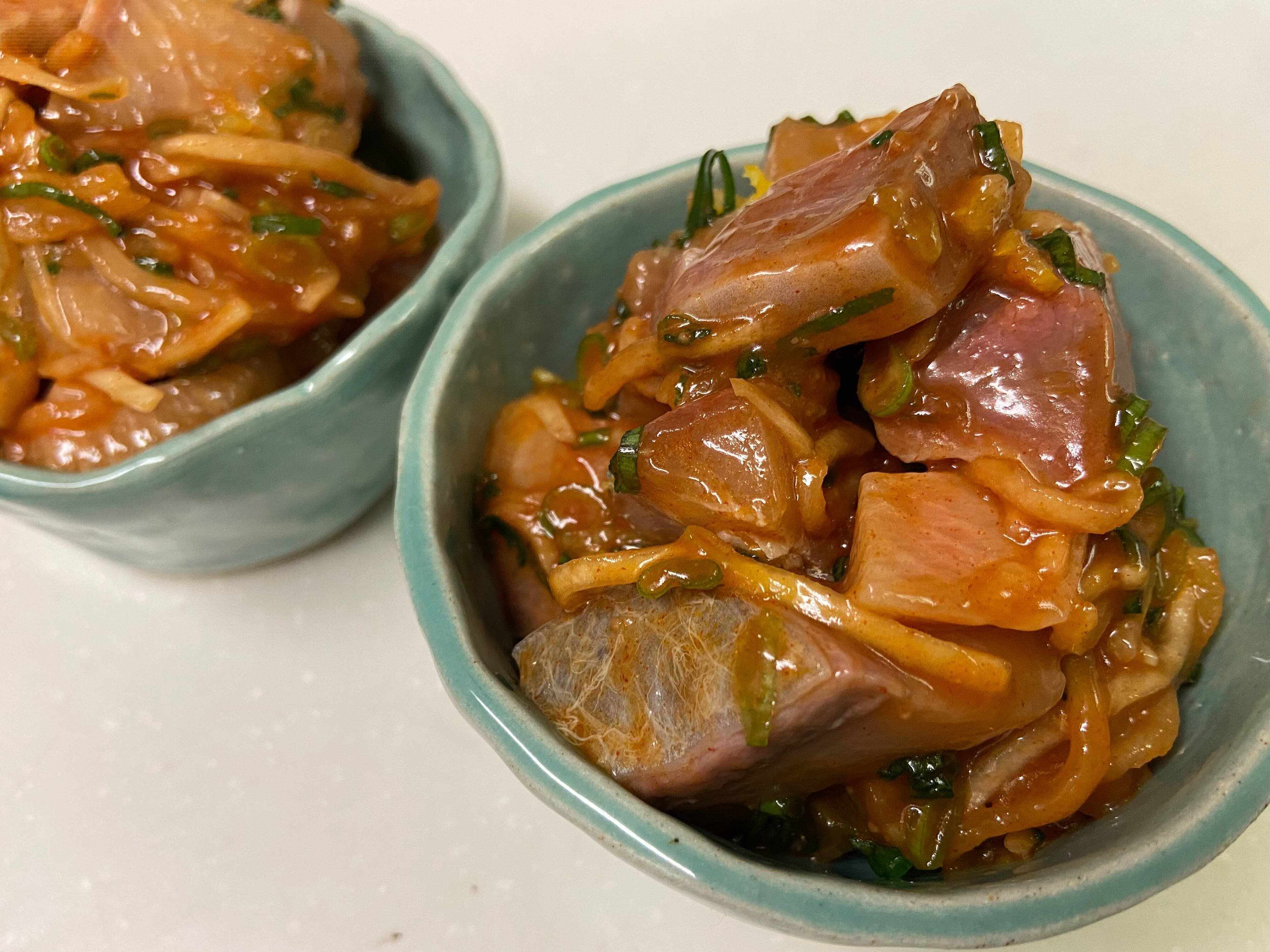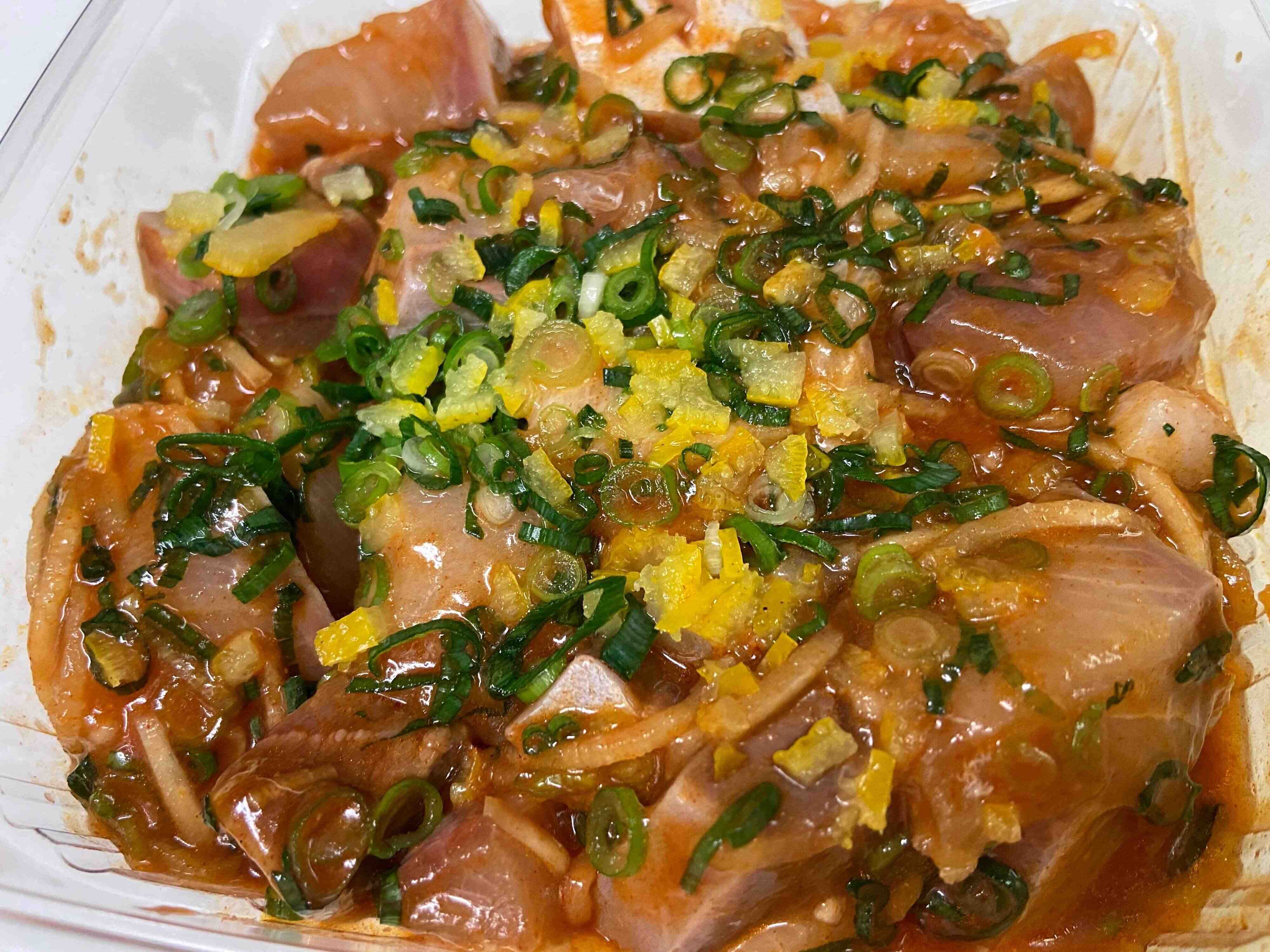 一口サイズにカットされたぶりの切身が、醤油・砂糖・味噌・にんにくや香辛料などを使ったスパイシーポキソースに漬け込まれています。