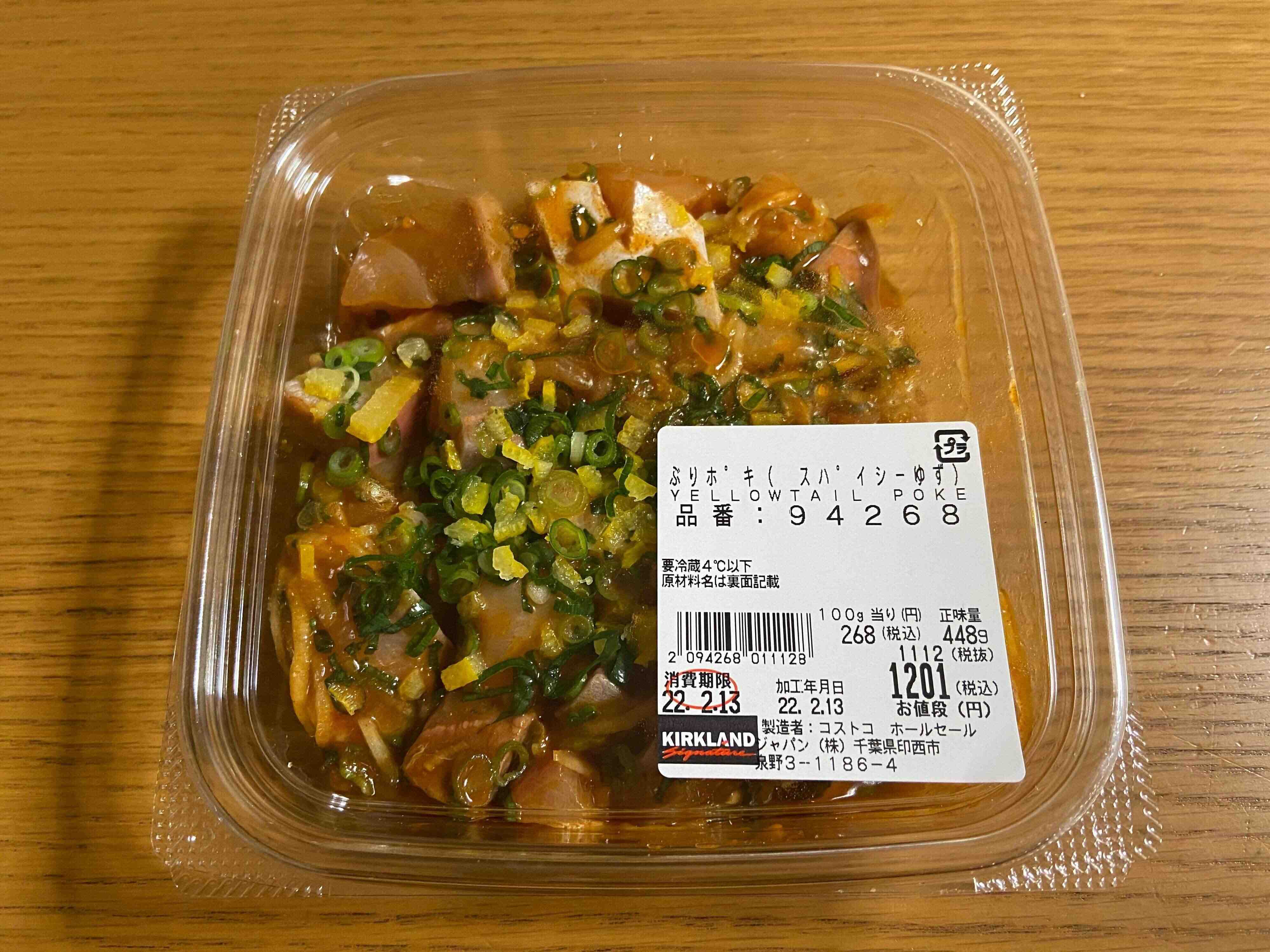 ポキといえばまぐろやサーモンが定番ですが、コストコではぶりを使ったポキも人気です。今回登場したのは「ぶりポキ(スパイシーゆず)」購入時価格:1,201円。