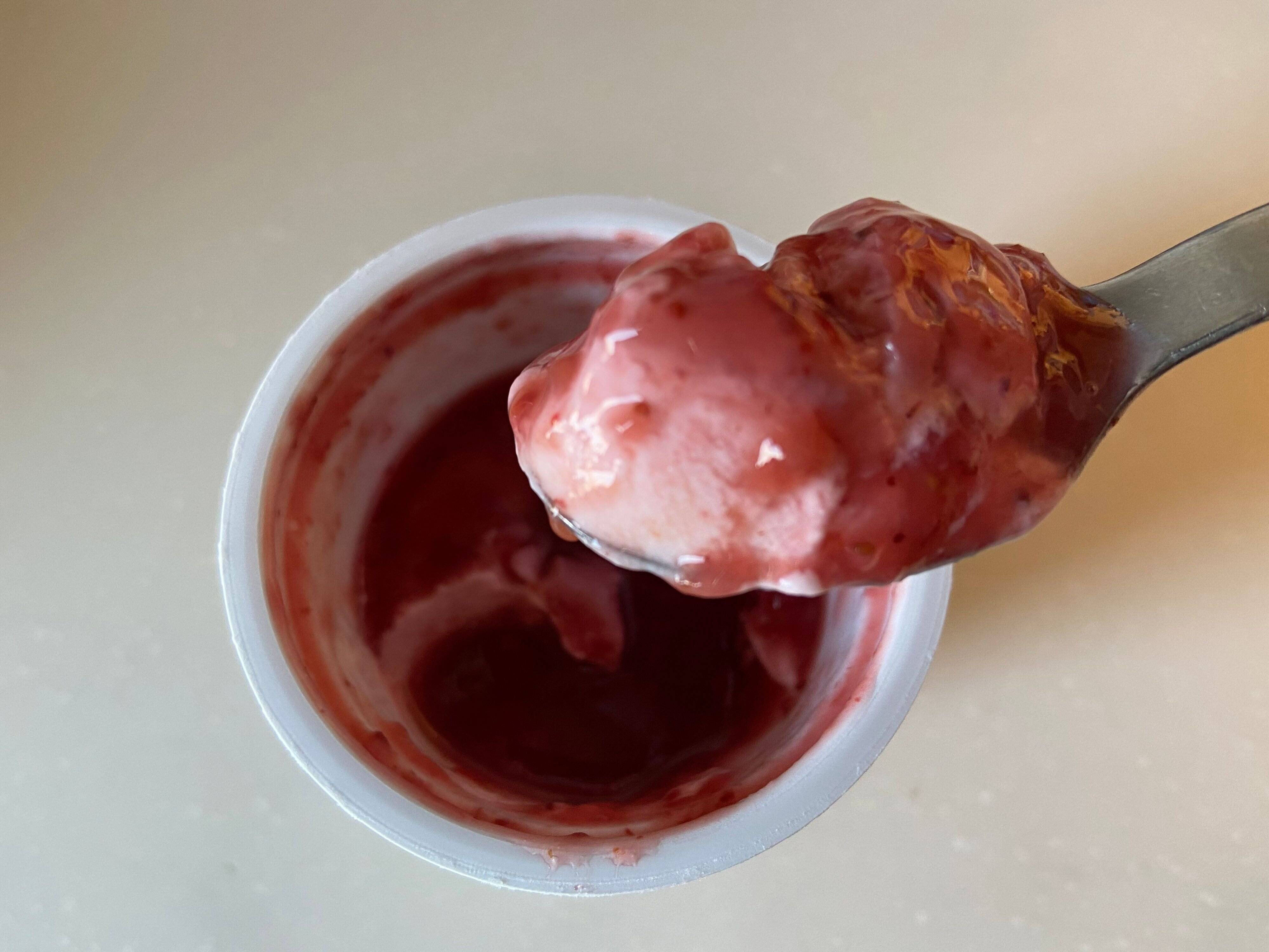 スプーンを入れてまず驚きました。フルーツソースの量がとても多いんです。こんなにフルーツソースたっぷりのヨーグルトは見たことがありません。