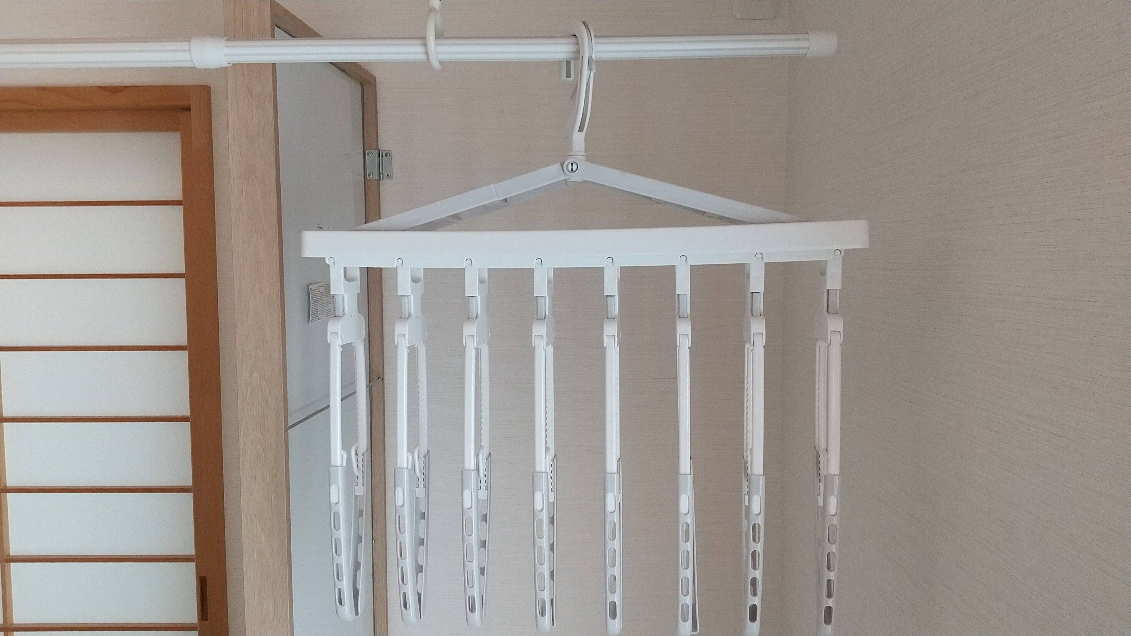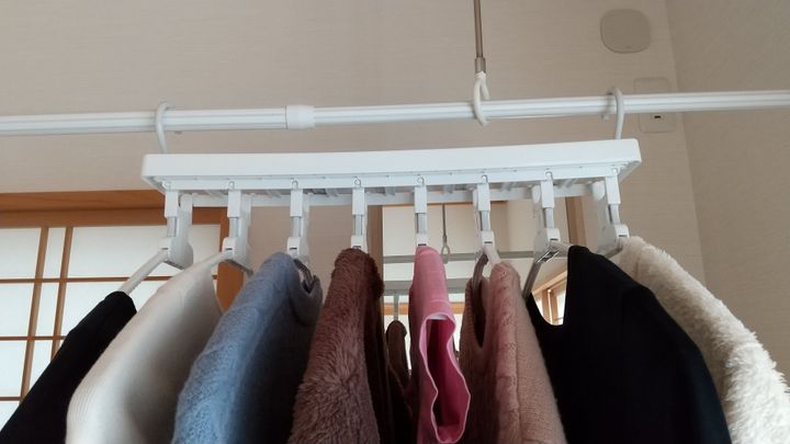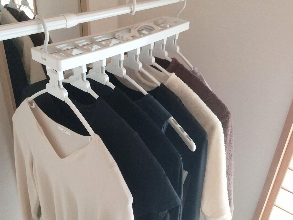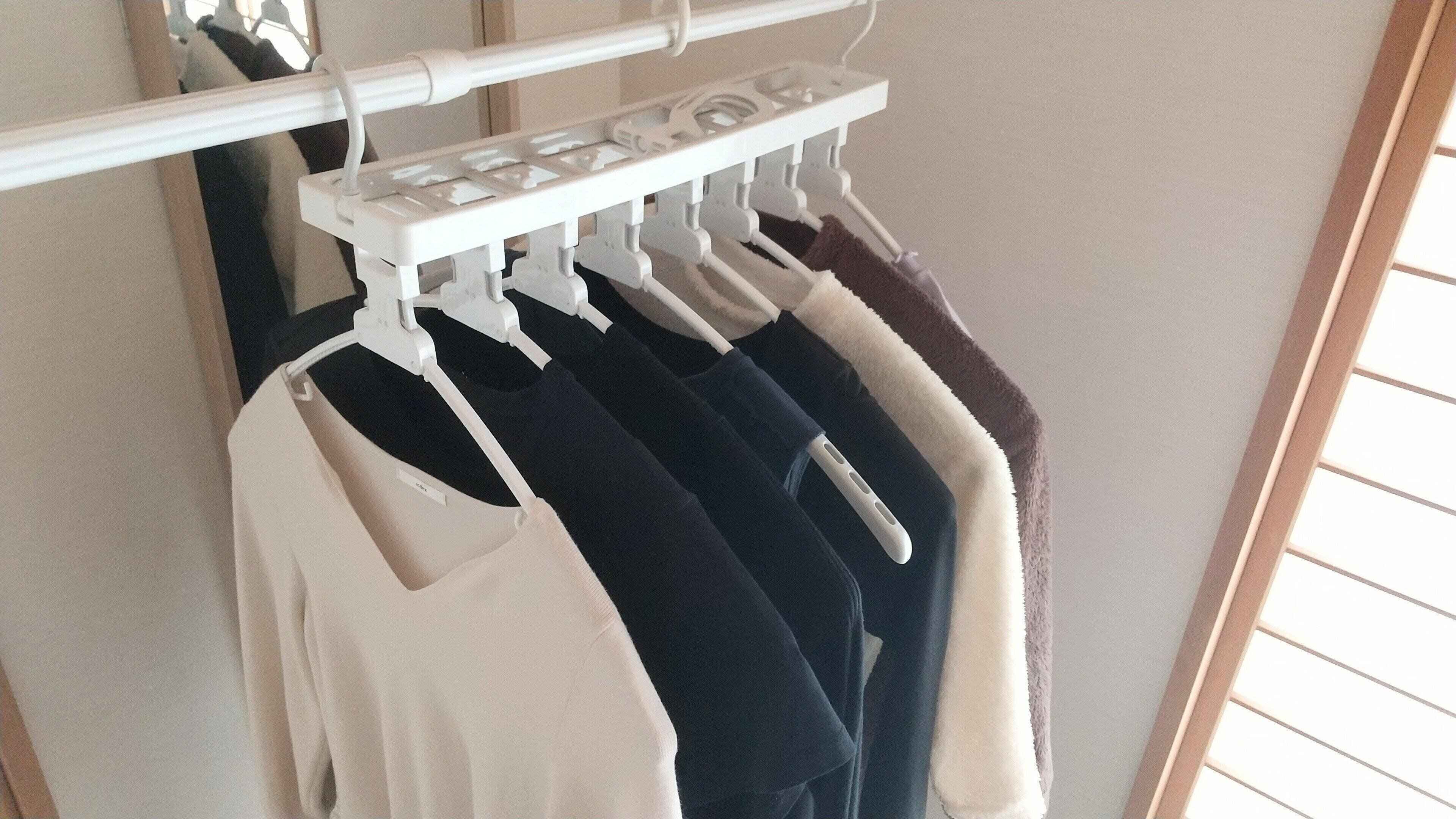 洋服をたくさん掛けるとなるとその分ハンガーがたくさん必要になり、ハンガーの管理も面倒に。この商品なら1つで8着分の洋服が掛けられるので、一気にたくさん干せてとても便利です。