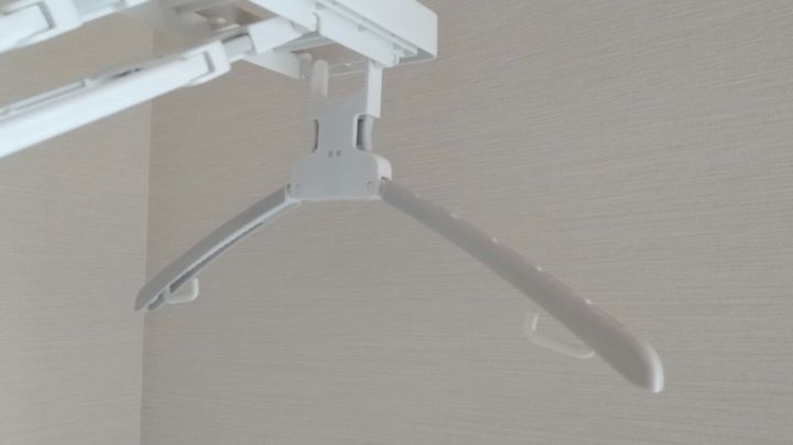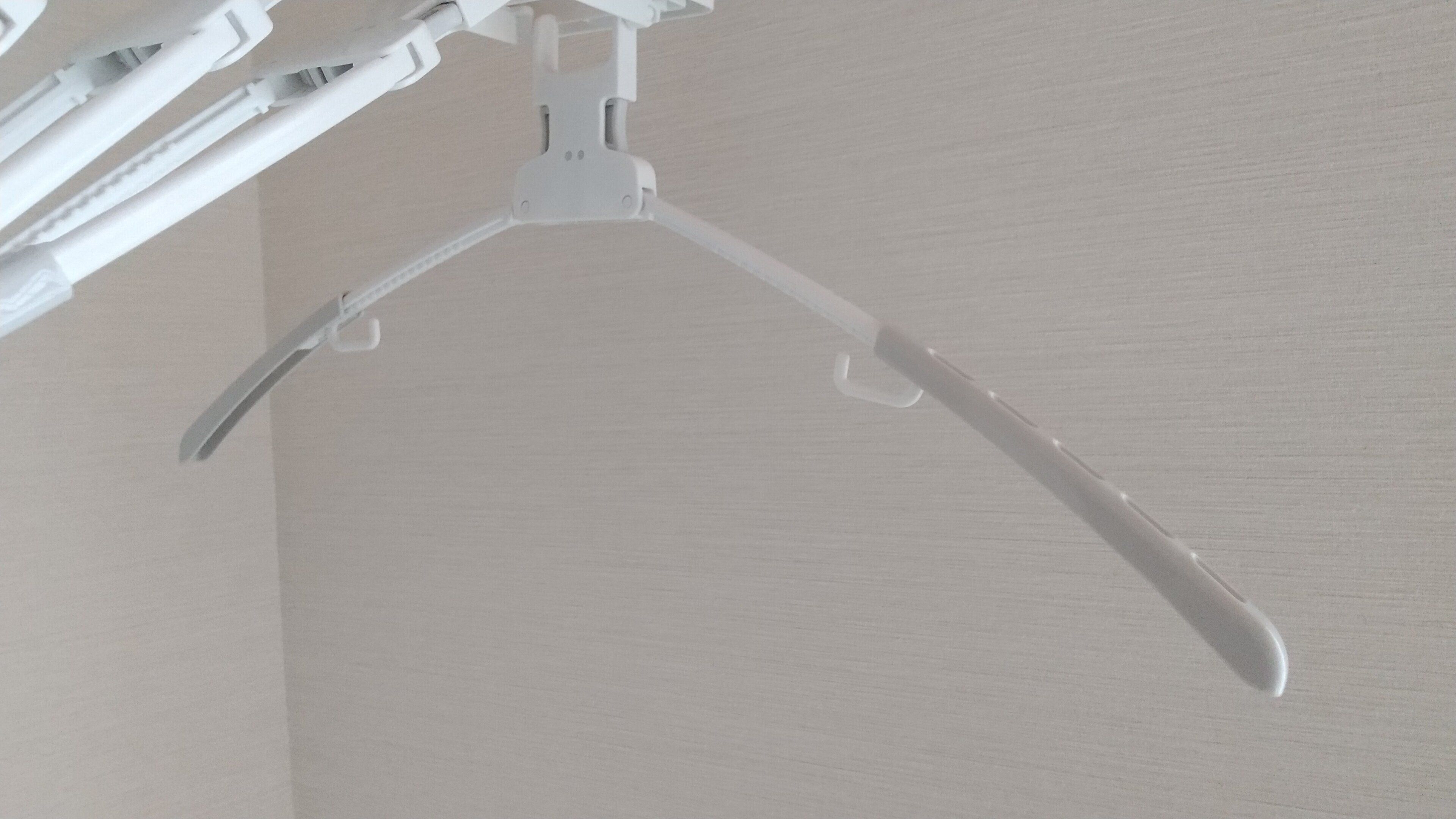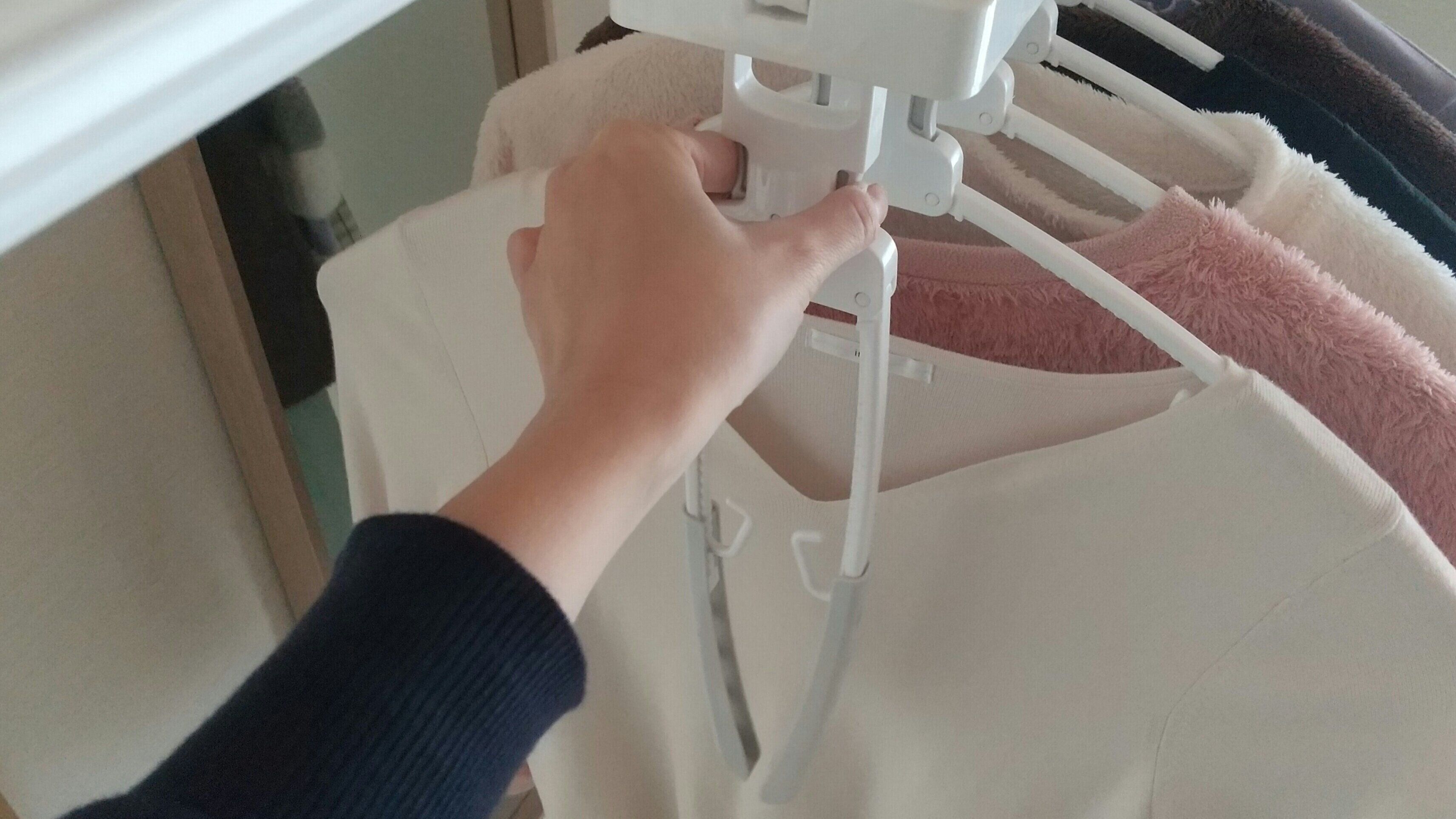 ハンガーのボタンをつまむとアームが閉じて、洗濯物をワンタッチで取り込むことができます。