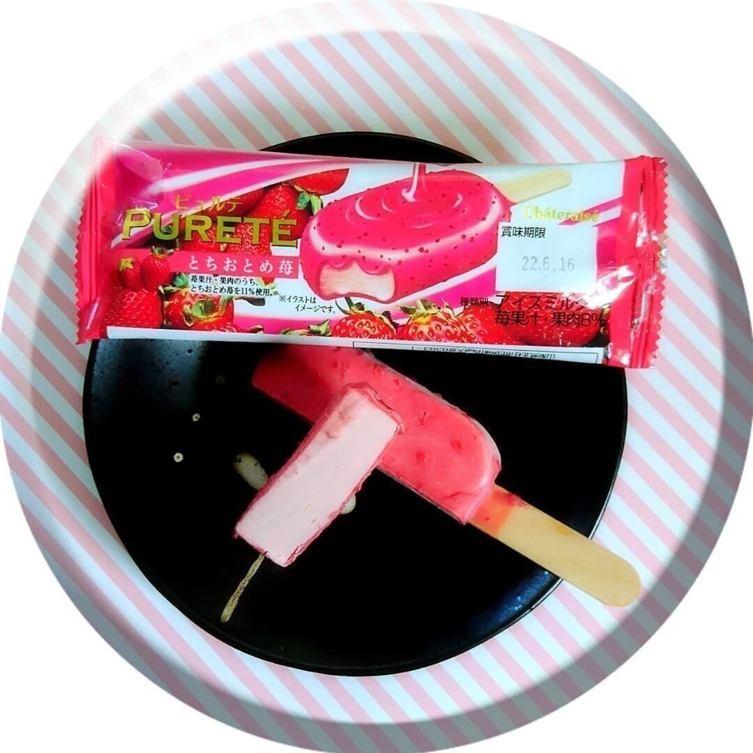 とちおとめ苺と北海道産生クリームのアイスに、甘酸っぱい濃厚苺チョコをコーティングしたアイスバー「ピュルテ」。ちょっと贅沢な大人のアイスが、少しミニサイズなものの、わずか80円という激安価格で味わえますよ!
