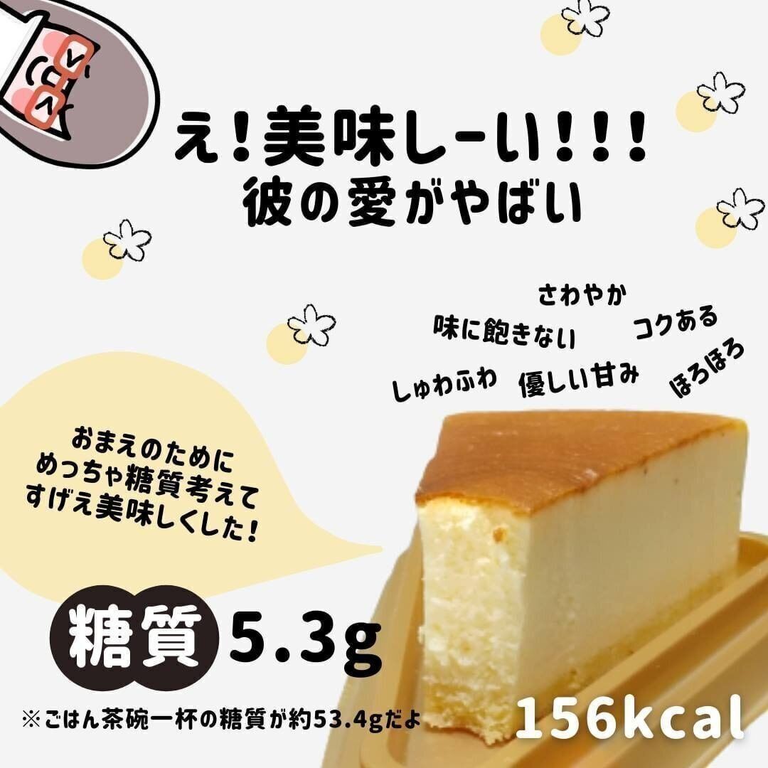 砂糖の一部を体に吸収されにくい糖(エリスリトール)や食物繊維に置き換えたスフレチーズケーキです。また、小麦粉の代わりに体に吸収されにくいでん粉を使用しているので糖質を大幅に抑えています。156kcalと低カロリーなので、ダイエットに最適なケーキですね。美容と健康に効果があるだけでなく、おいしくて食べごたえがあるのもうれしいポイント。濃厚なのにしつこすぎないので罪悪感なく口にできて満足度の高いスイーツです。