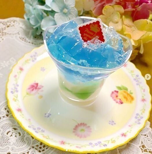 こちらのバタフライピーのカップデザートはキラキラしたブルーのクラッシュゼリーとヨーグルトクリームを重ね、あじさいをイメージしたスイーツです。別添えのレモンをかけるとゼリーがほんのり紫色に!さっぱりと食べられるこちらのデザートは1個280円です。