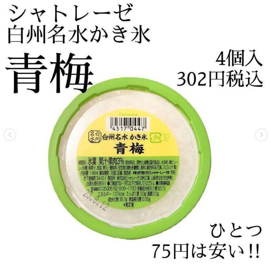 白州名水かき氷 青梅は、サッパリとしたザクザク食感のかき氷と、濃厚な青梅ペーストがおいしい人気商品。よく混ぜて食べるのもおすすめで、梅の酸味が苦手なかたでも食べやすいと評判ですよ。おいしくて安い、コスパのよさもポイントです。