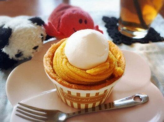 マドレーヌ生地に黄栗のクリームがのったかわいらしいカップケーキは280円。生地にもカスタードクリームがたっぷりと入っており、どこを食べてもクリームが楽しめる贅沢なモンブランです。