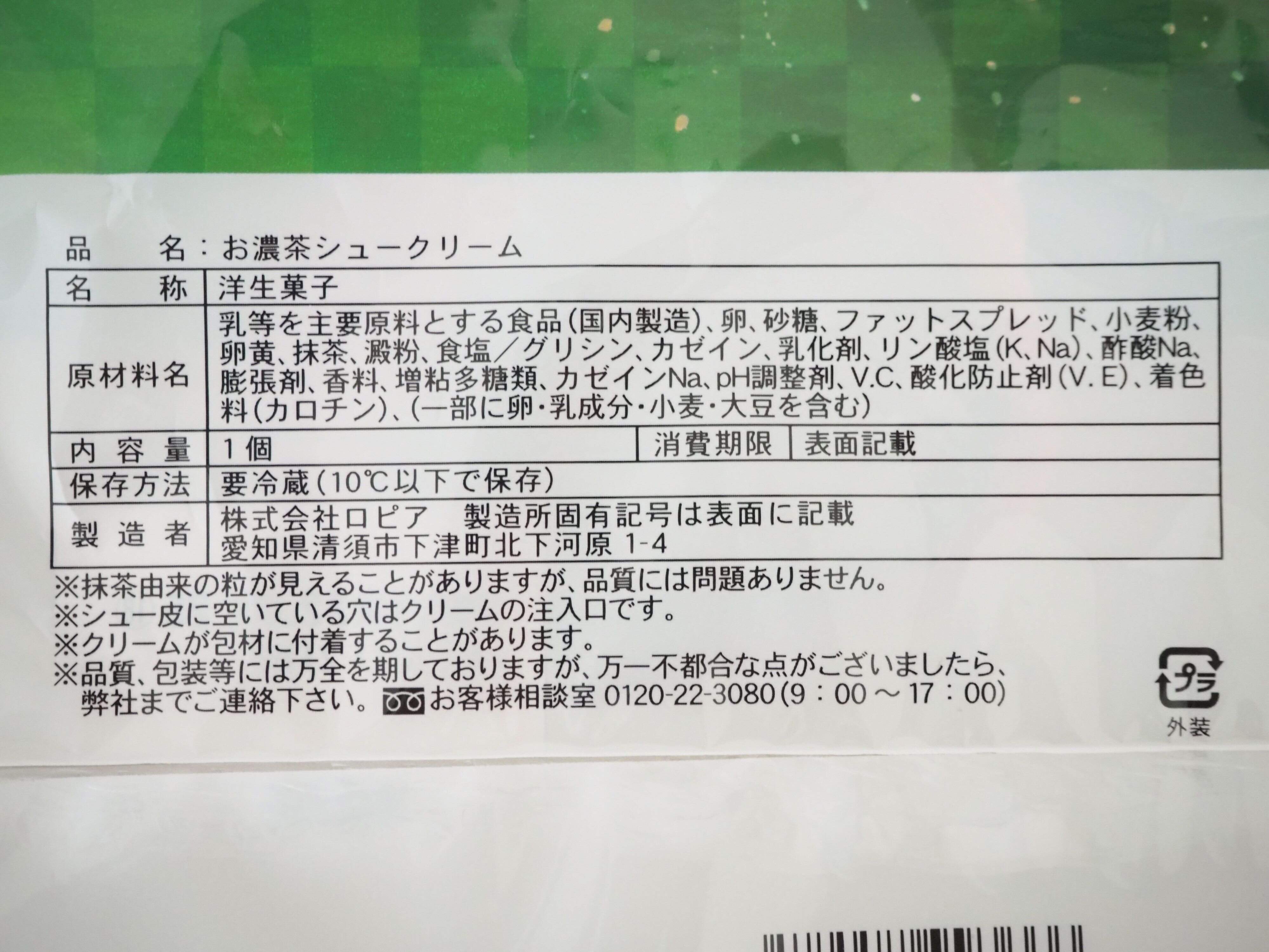 原材料を確認すると、確かに抹茶が使用されています。製造は自社スイーツも展開しているロピアが担当。