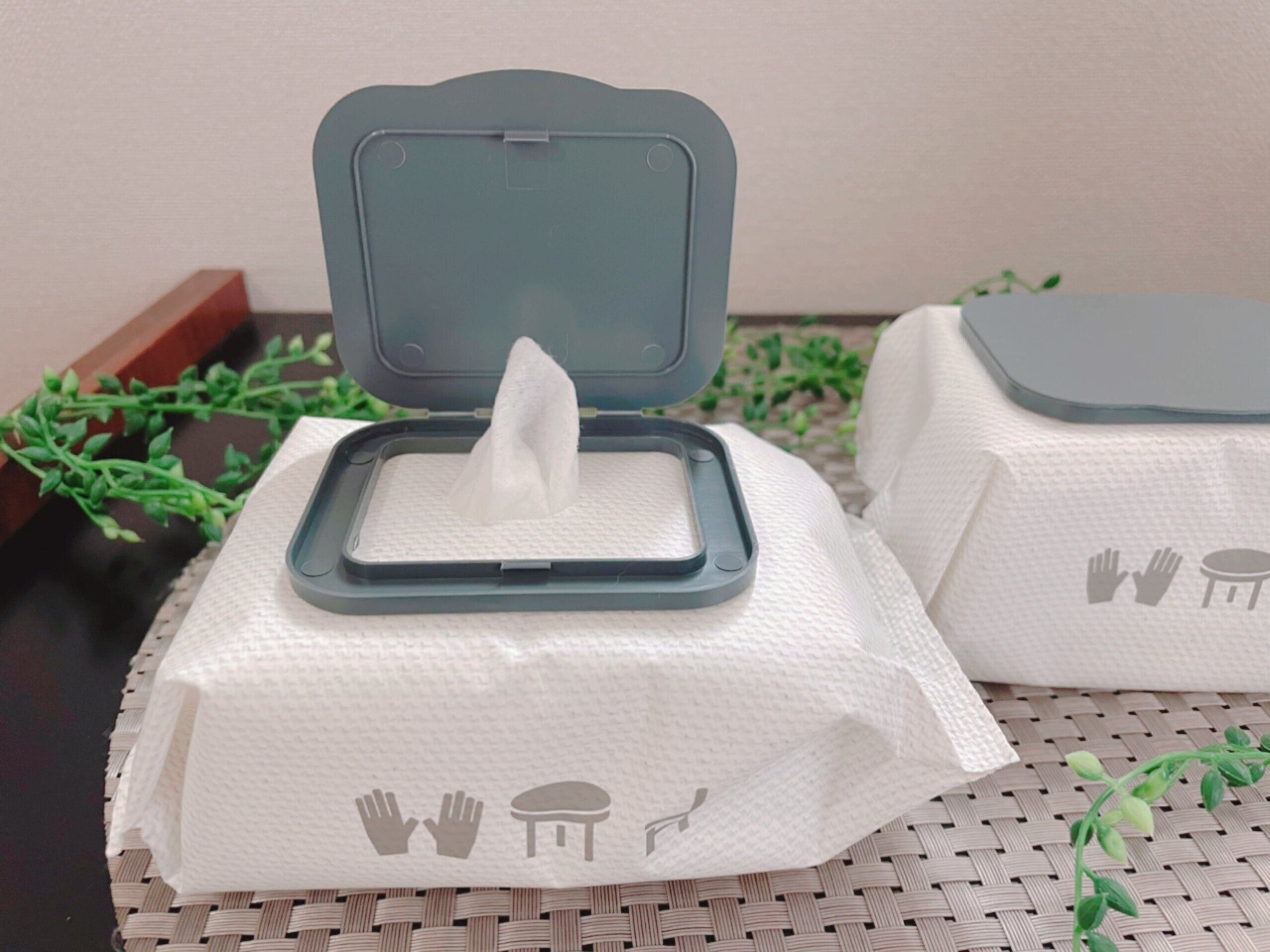 インテリアの邪魔をしない、フタがグレーでお洒落なウェットティッシュ。フタ付きで乾燥を防ぎ、最後までしっかり使うことができます。