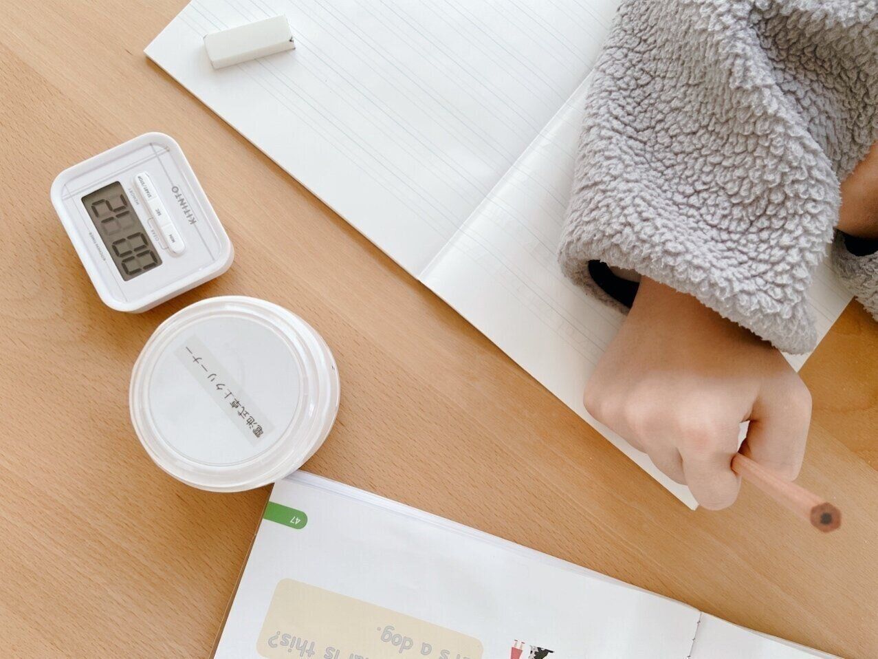 そんな時間管理に役立つのがキッチンタイマー。我が家のタイマーは3COINSのものですが、カウントアップとカウンドダウンができて子どもでも簡単に管理できればどんなタイマーでもOKです。
