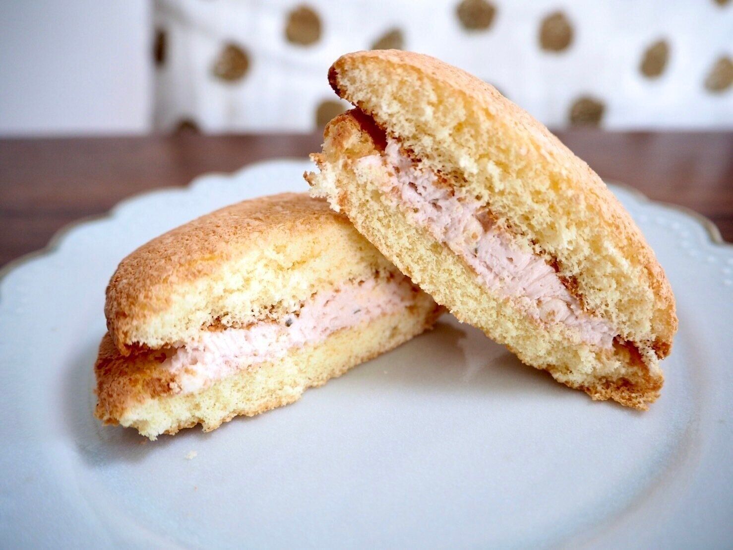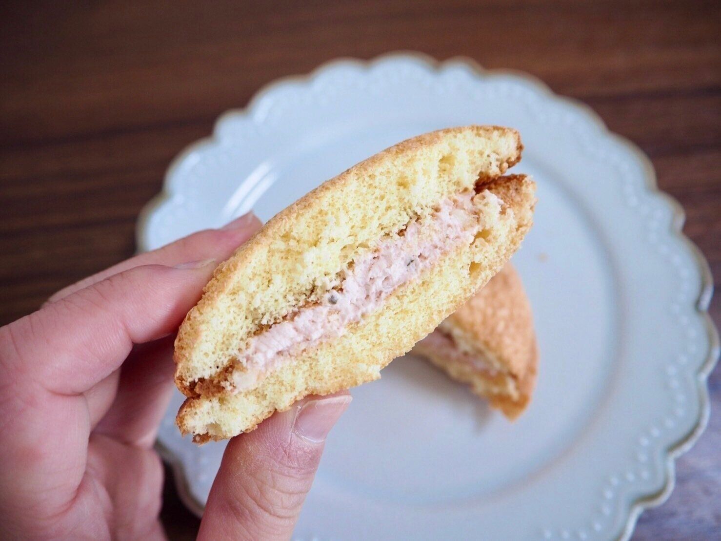 断面を見てみると、淡いピンク色のクリームがたっぷりとサンドされています。