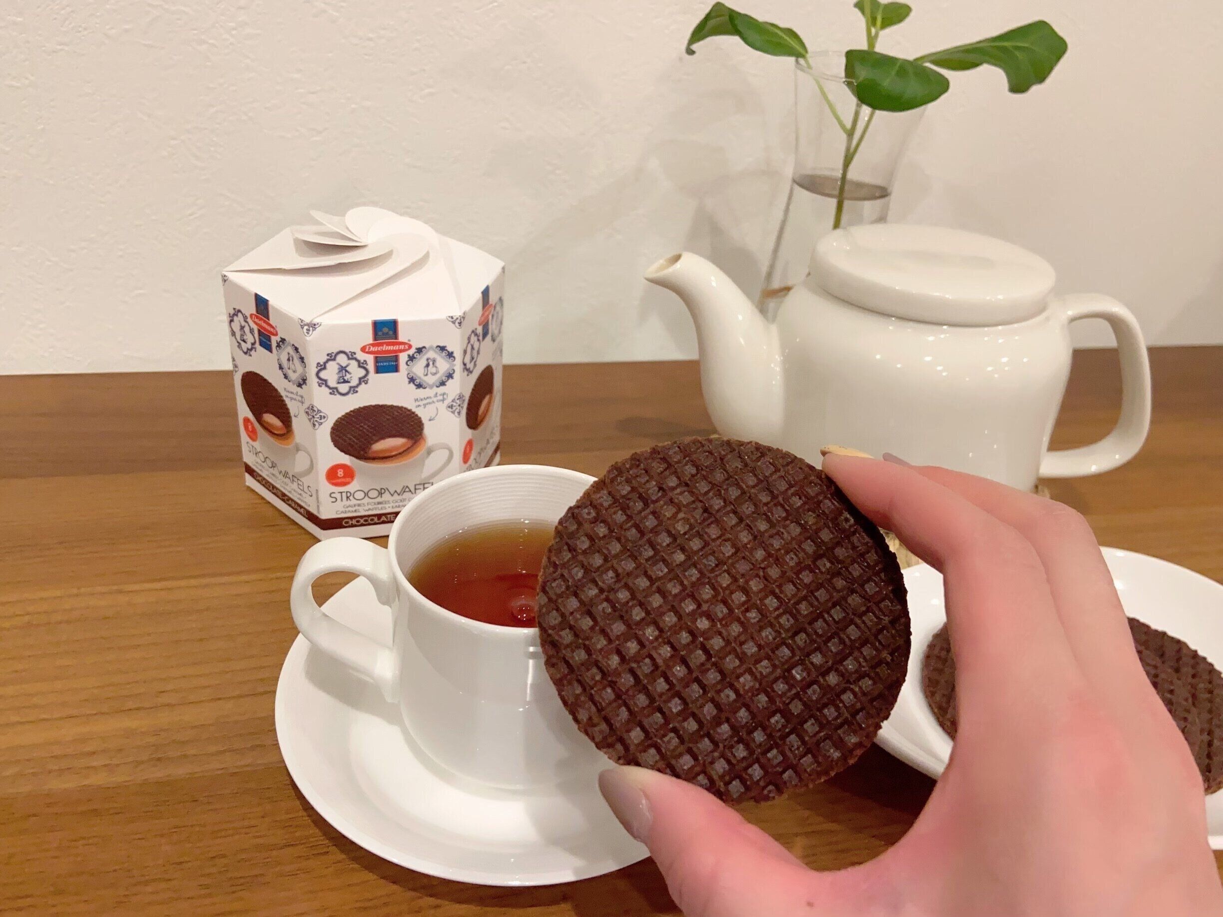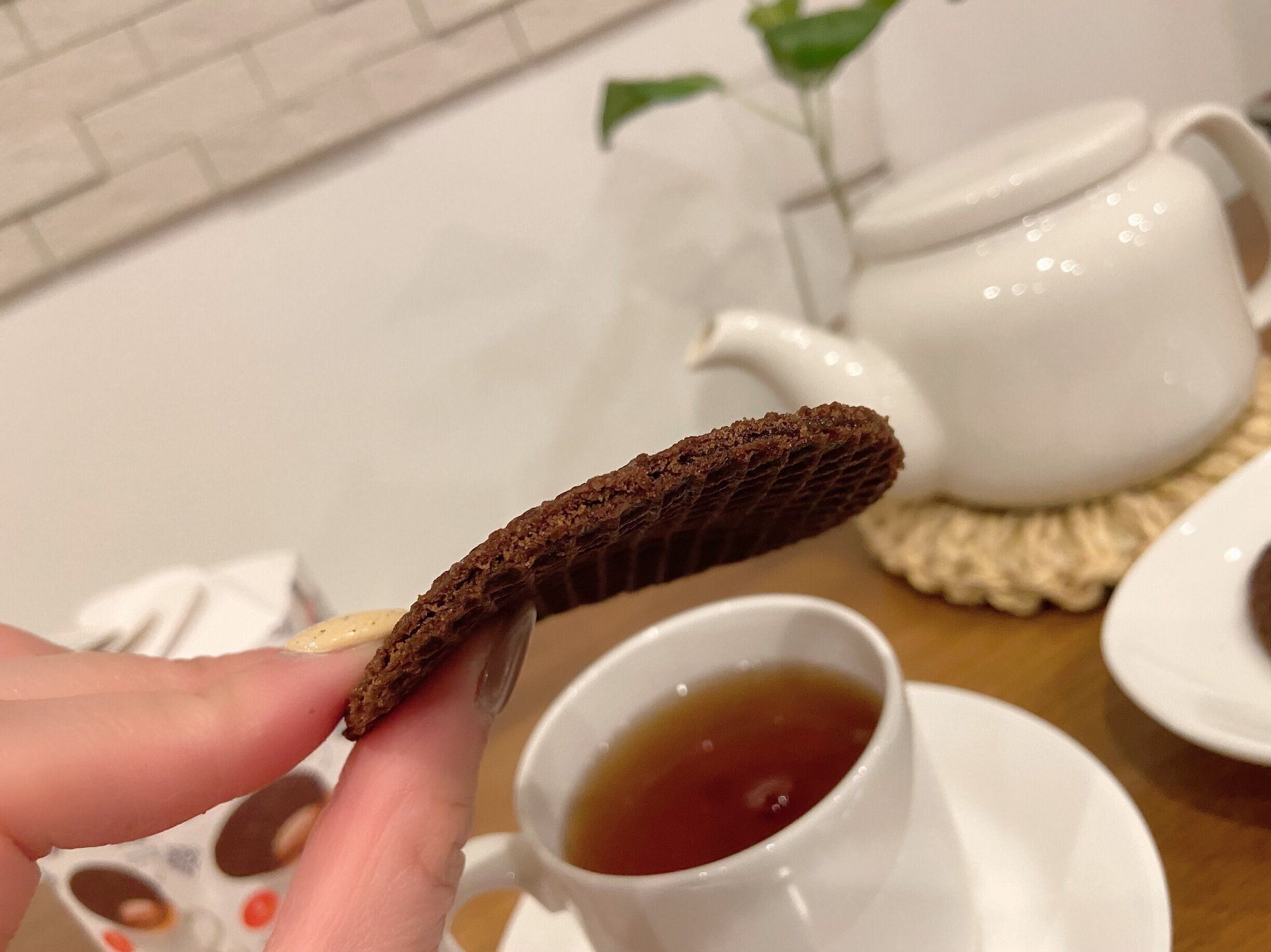早速、ワクワクしながら温かい紅茶を入れて、カップの上にワッフルをのせました。