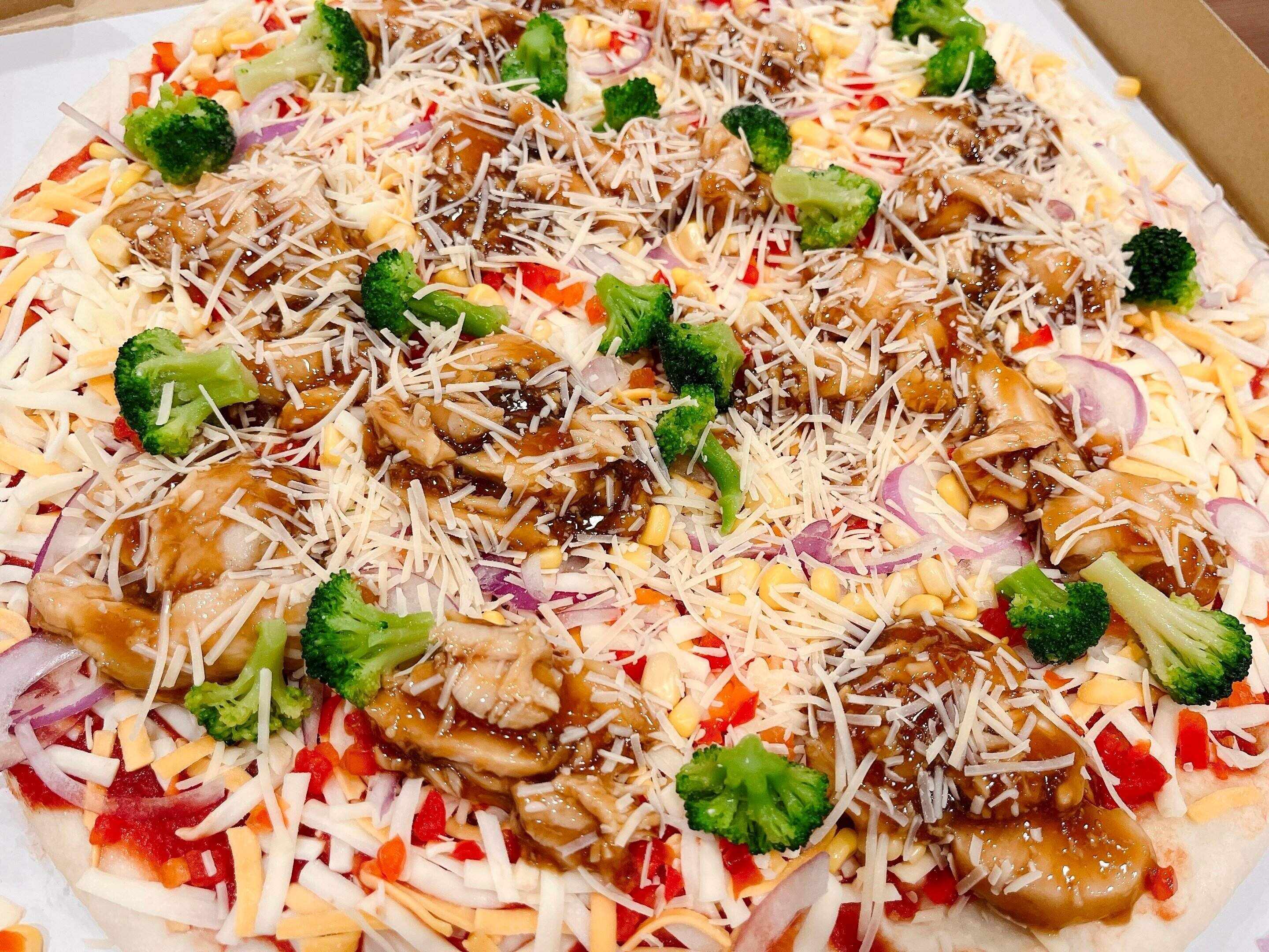 3種類のチーズ、照り焼きチキン、コーン、パプリカ、紫玉ねぎ、ブロッコリーとたくさんの具がのっていてボリューム満点のピザです。彩りが綺麗な点もポイント高いです。