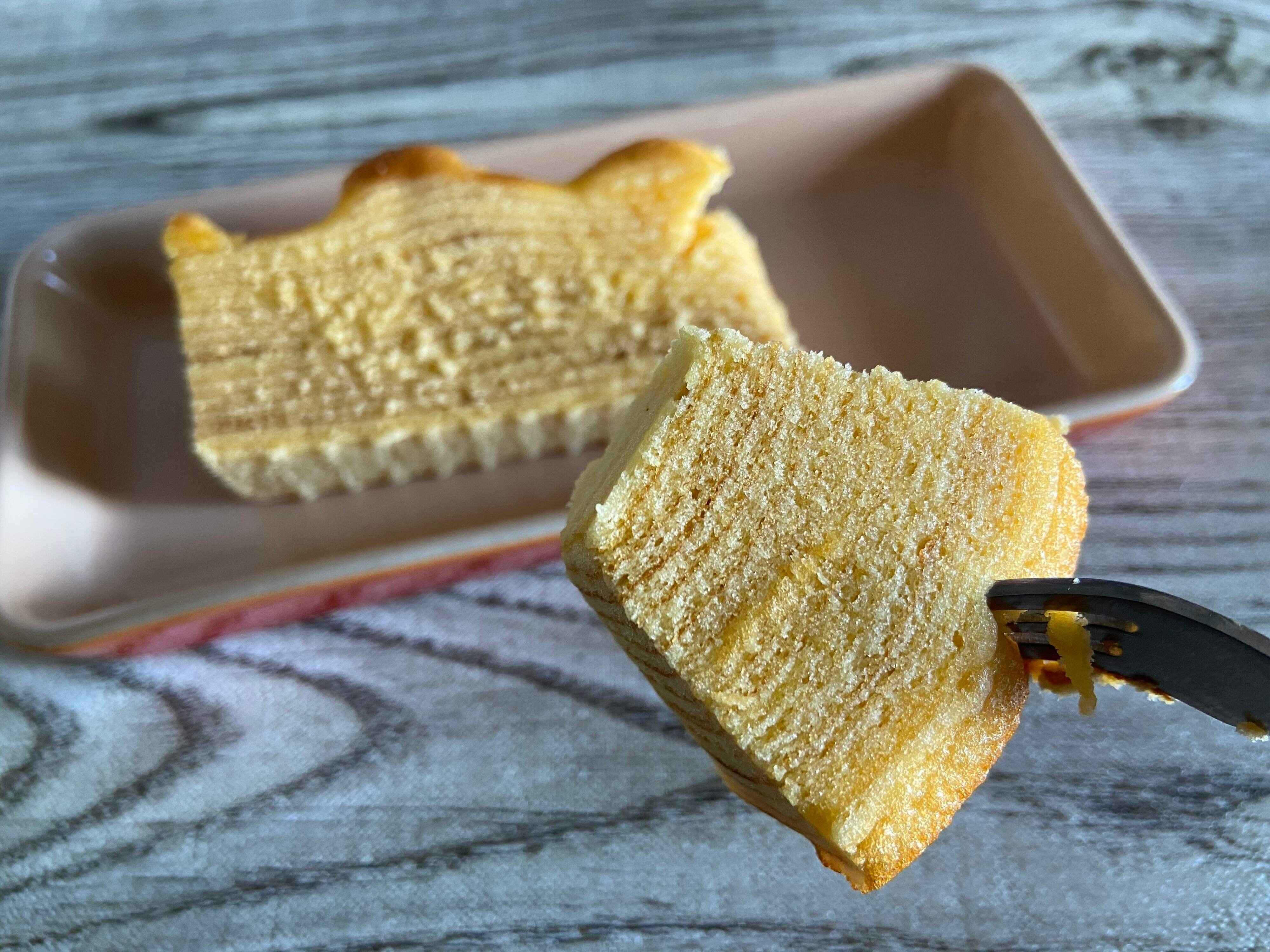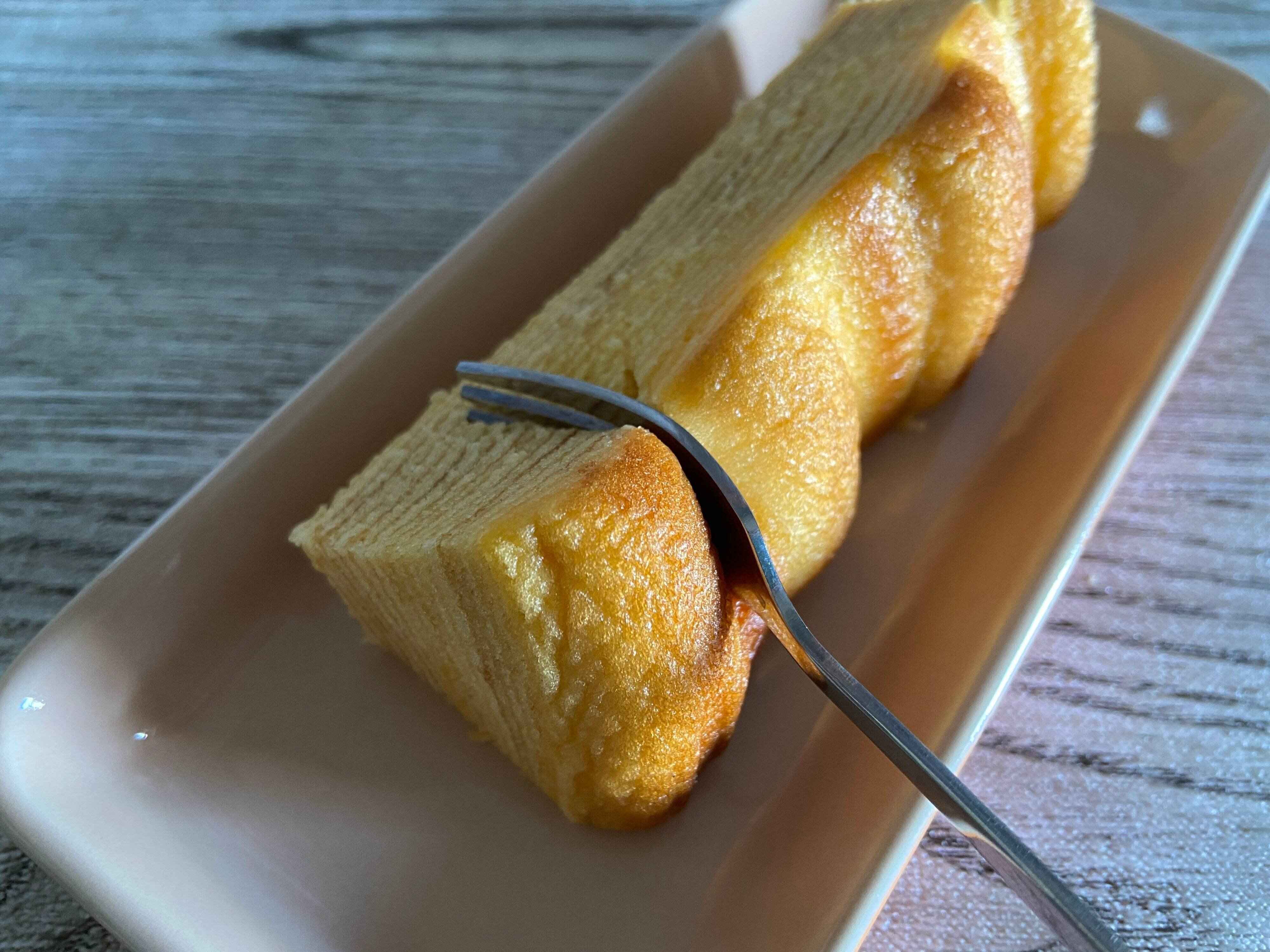 何層にも重なったバウムクーヘンにフォークを入れてみると、意外にずっしり感が。さっそく食べてみます!