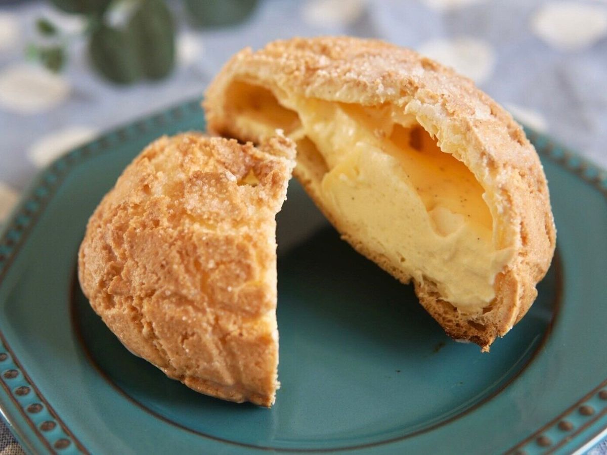 まるでメロンパンみたい!サクサクな生地とクリームを楽しめるシュークリーム。シューパフの上にメロンパンのような格子が入ったクッキー生地を重ねて、グラニュー糖をつけて焼き上げました。シュー生地の中には、北海道産生クリームとバニラシードが入ったミルク感のあるホイップカスタードを注入しました。