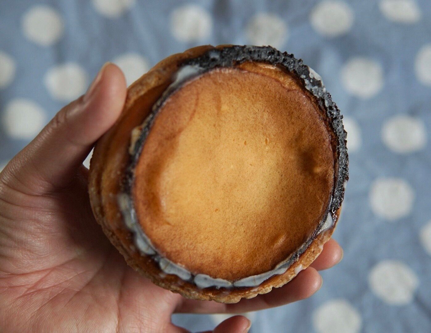 裏側を見ると、ふちが焦がしたかのように黒くなっていますが、香ばしさは感じても苦みが気になる感じではありません。下側の生地は、本来のシュークリーム生地のような柔らかさながら、通常のシュークリームより少し厚めでしっかりしている感じもしました。