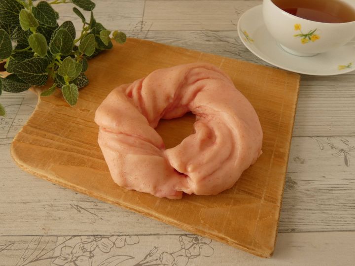 リング状に焼いてある生地で、表面はいちごチョコでコーティングしてあります。