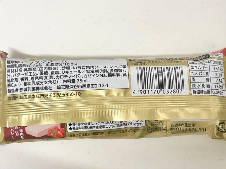 原材料を見ると乳製品に続いて砂糖、いちご果肉ソース、いちご果汁といちごが存分に味わえることが分かります。