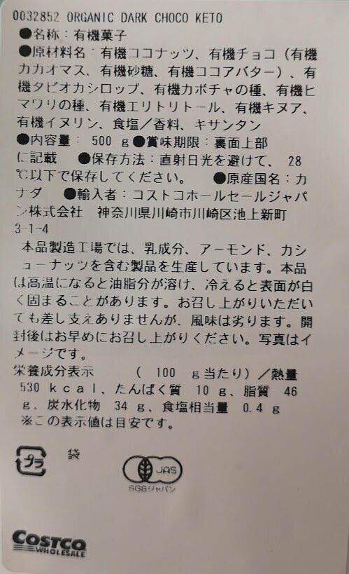 ●原材料名 有機ココナッツ、 有機チョコ (有機カカオマス、有機砂糖、有機ココアバター) 有機タピオカシロップ、 有機カボチャの種、 有機ヒマワリの種、有機エリトリトール、 有機キヌア、有機イヌリン、食塩/香料、キサンタン