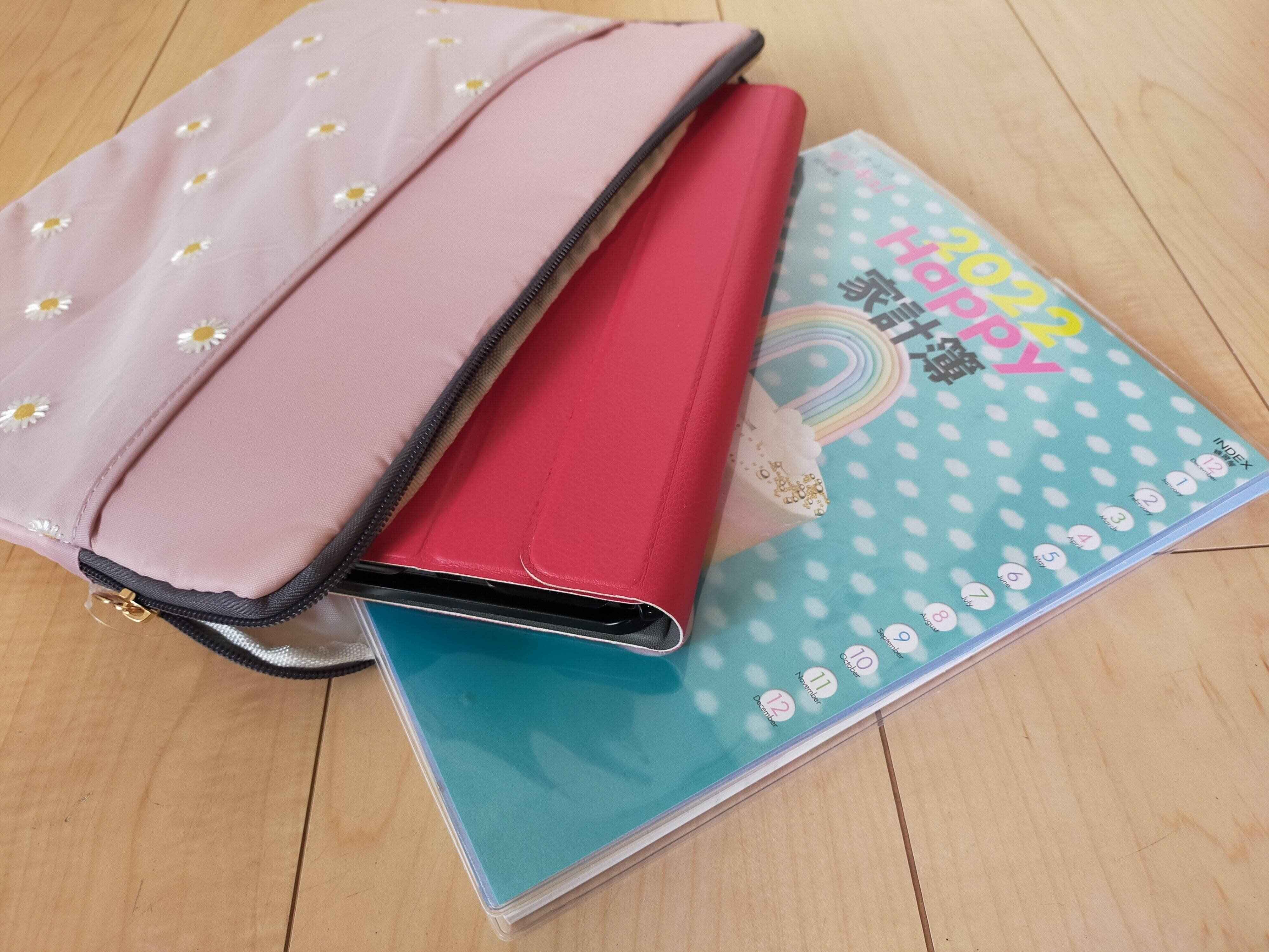 理由は、家計簿と一緒にできるから。PCケースはA4サイズもすっぽり入る大きさです。もともとタブレットにカバーをしていたので、収納にとても役立ちます。