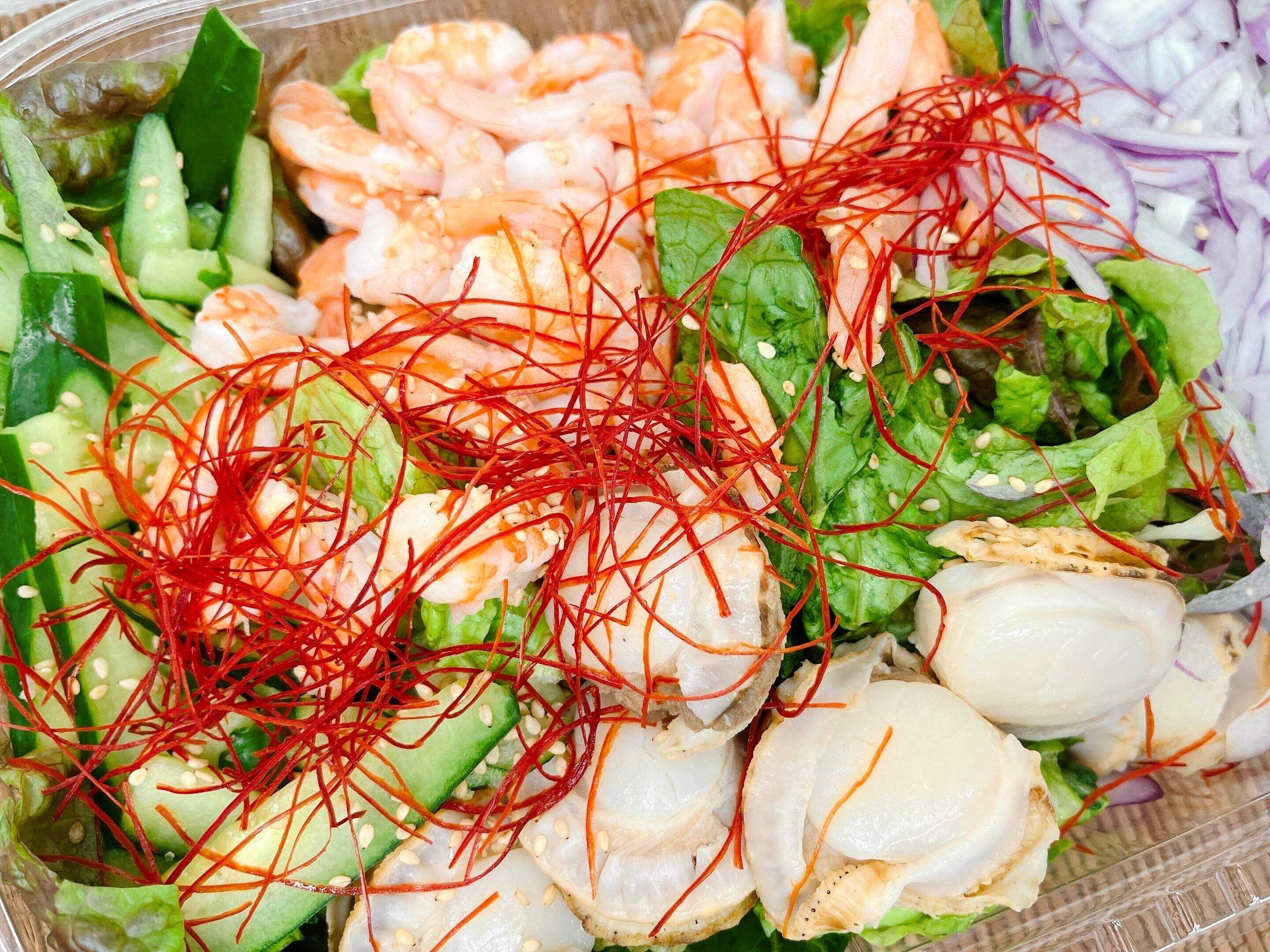 ホタテ、エビはぷりぷりでフレッシュでたっぷり入っているので食べ応え抜群です。濃厚なドレッシングは、醤油ベースでごま油やにんにくの香りが食欲をそそります。