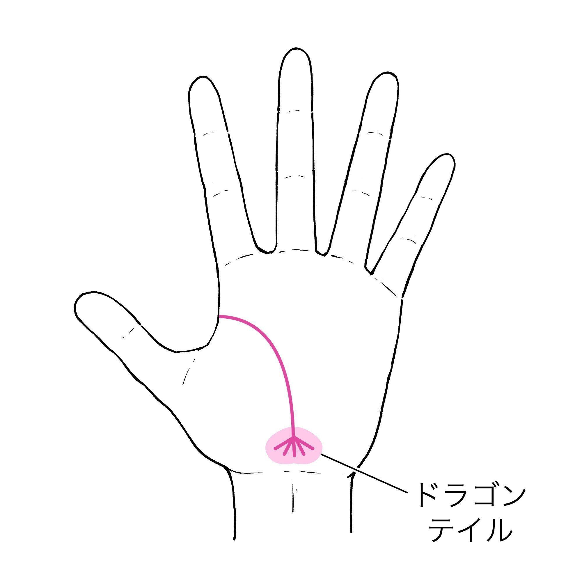 生命線が終わる手首の上あたりは「ドラゴンテイル」と呼ばれ、先祖や家族を表します。生命線の終わりがドラゴンテイルでいくつにも枝分かれしている場合は、家のトラブルが起きやすいので要注意!