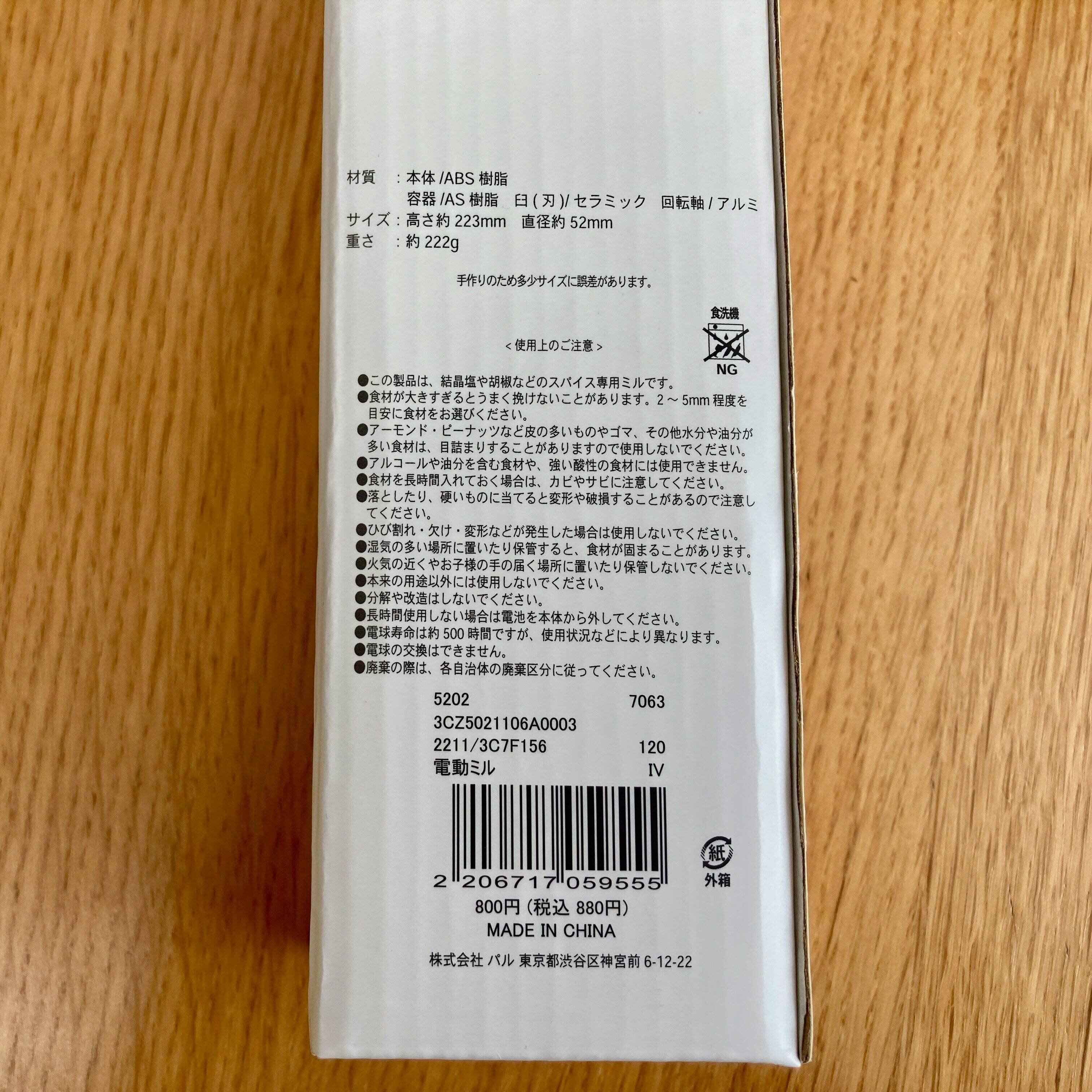 この電動ミル、説明書きを読むと岩塩のような結晶の塩や胡椒などを挽くことができます。油分の多いナッツ類は目詰まりする可能性があるそうなので使用はできません。ご注意ください。