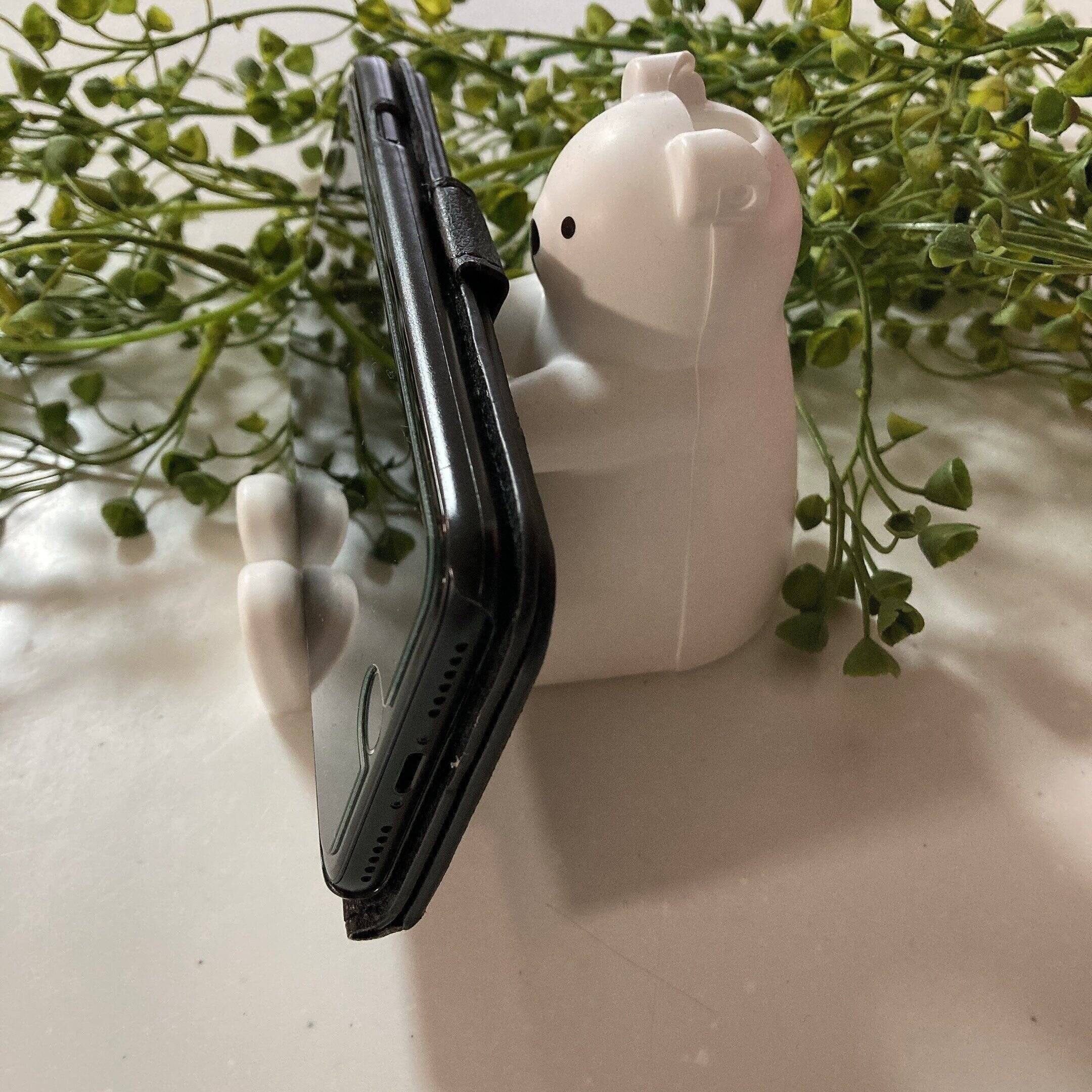 ちょこんと座ってるクマにスマホを乗せてるとしっかり抱えてくれます。