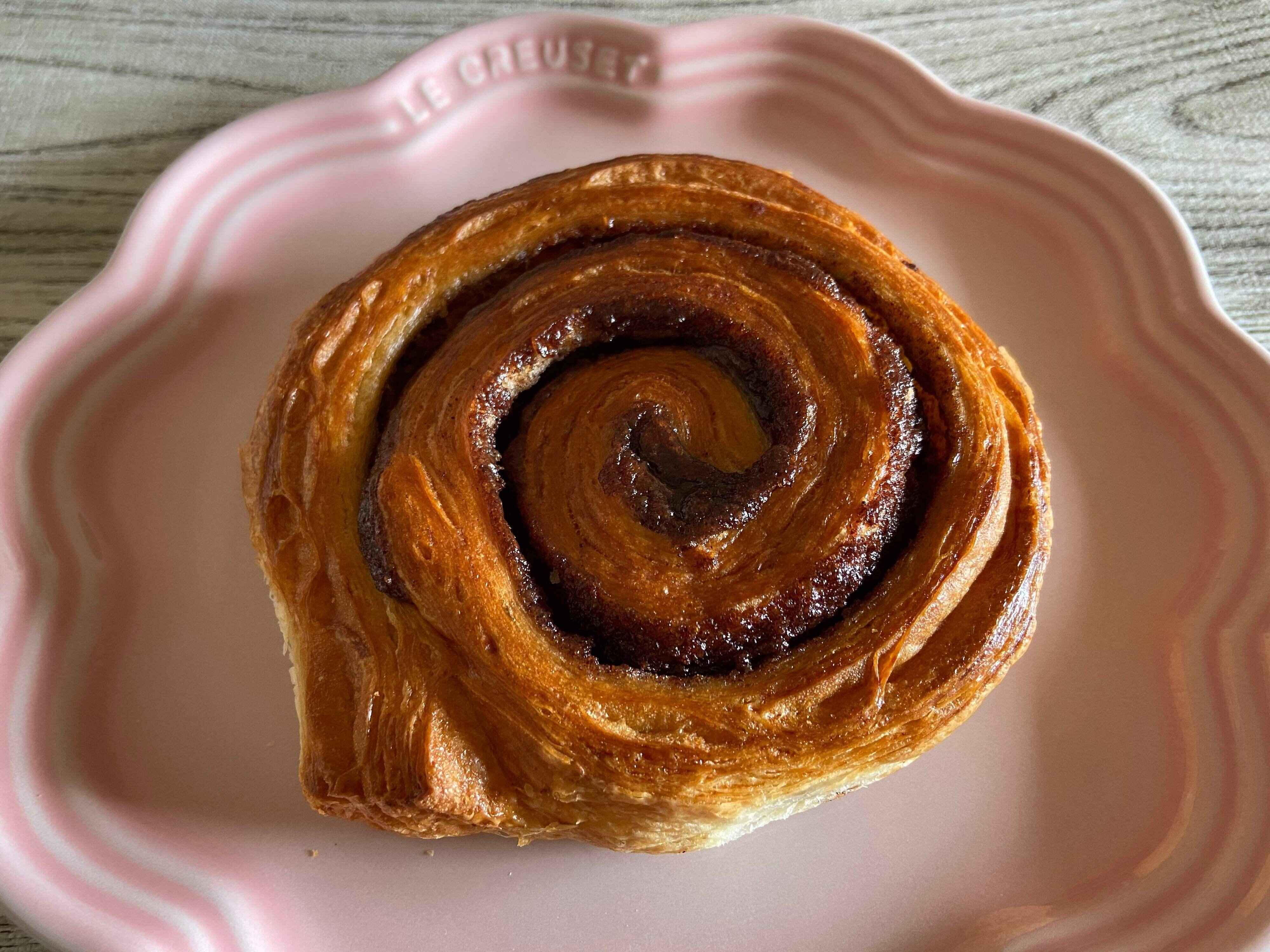 デニッシュのようなソフトなパン生地にシナモンフィリングが巻き込んであり、平たく大きめのロール状になっています。