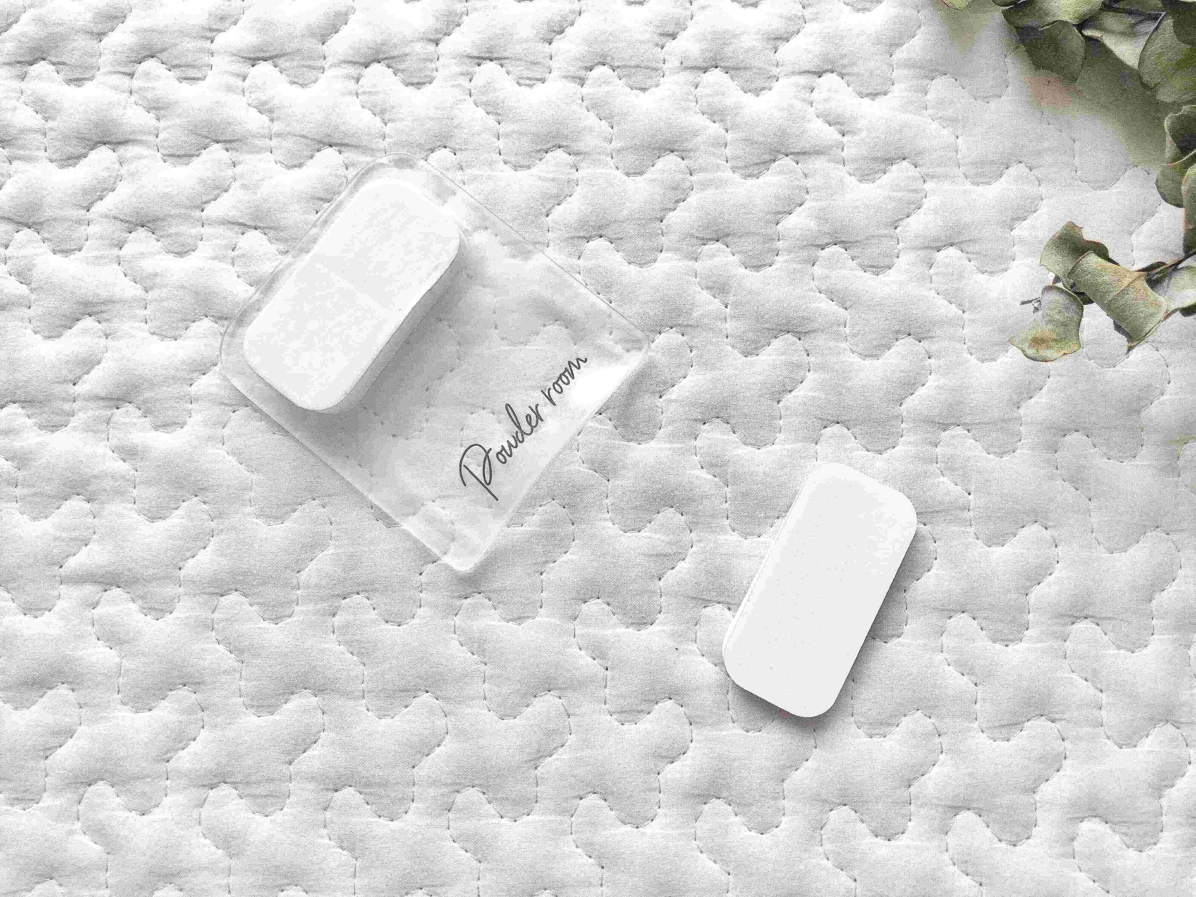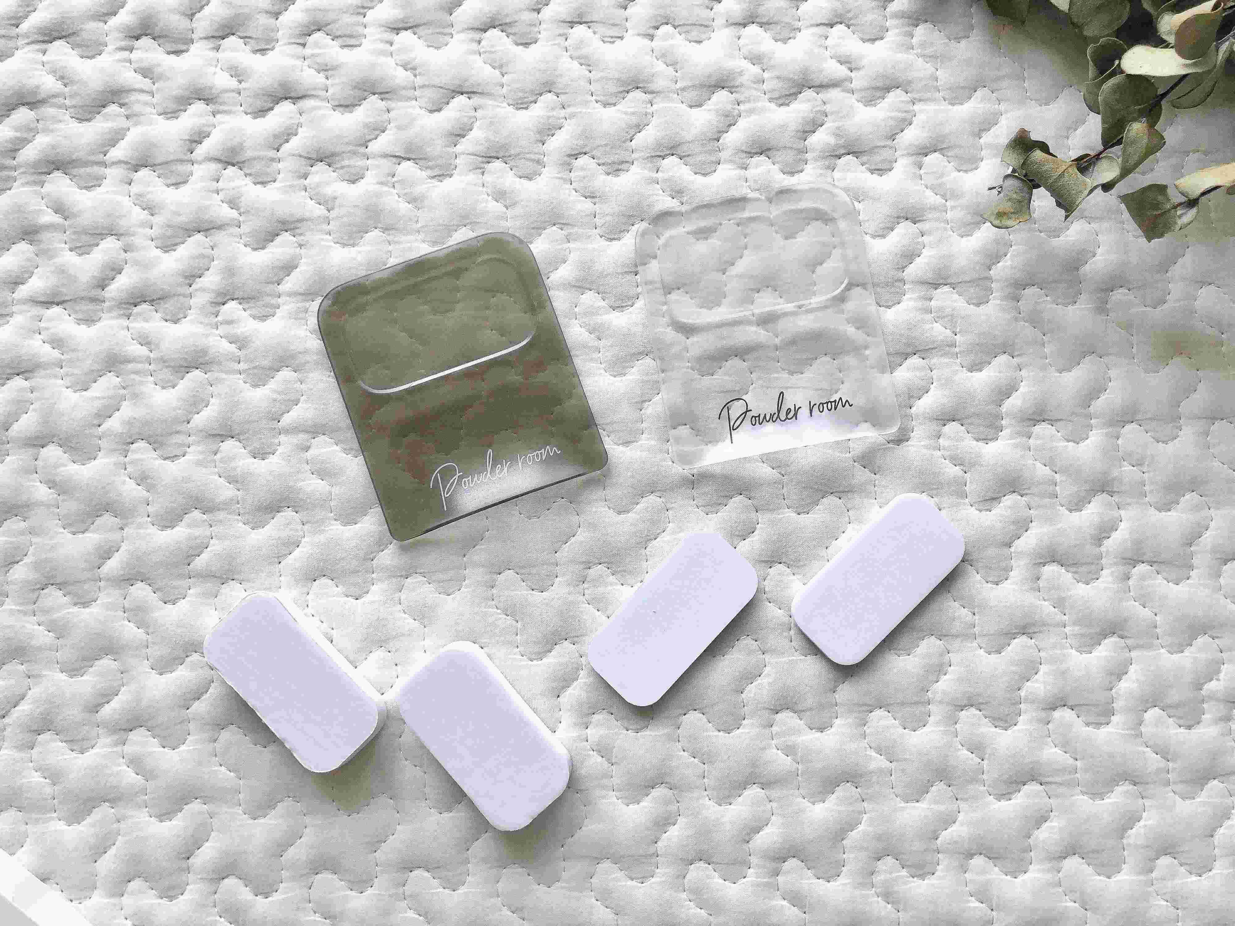 こちらが3COINSの『便座ハンドル』です。この透明にロゴが入ったデザインが、とってもオシャレですよね。クリアとチャコールの便座ハンドルが2個と、厚みの異なるスポンジが4個入って、330円で販売されています。