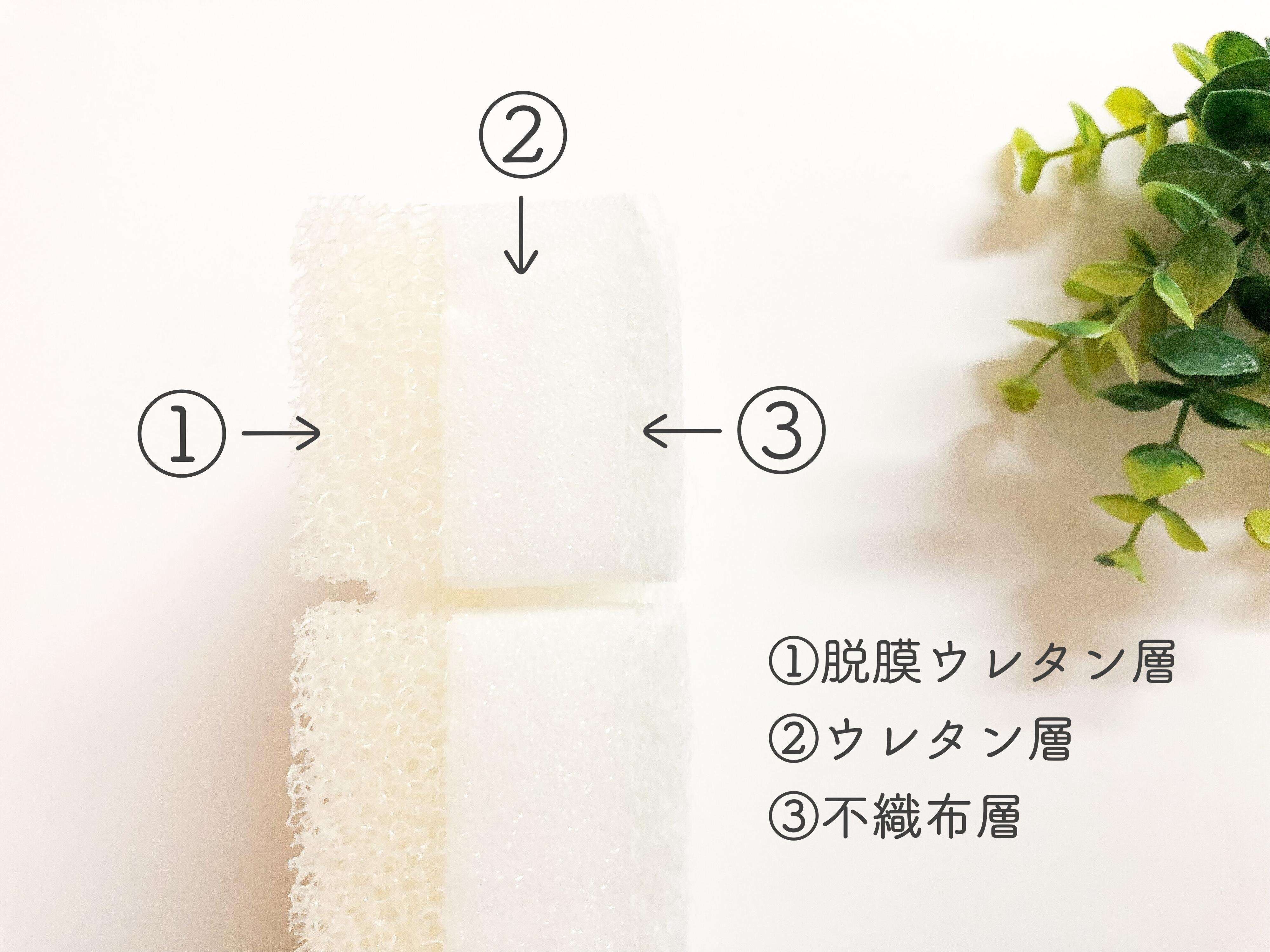 スポンジ自体は、脱膜ウレタン層・ウレタン層・不織布層の三層で出来ていて、少量の洗剤でも泡立ちが良く、頑固な汚れもスッキリ洗えるようになっています。