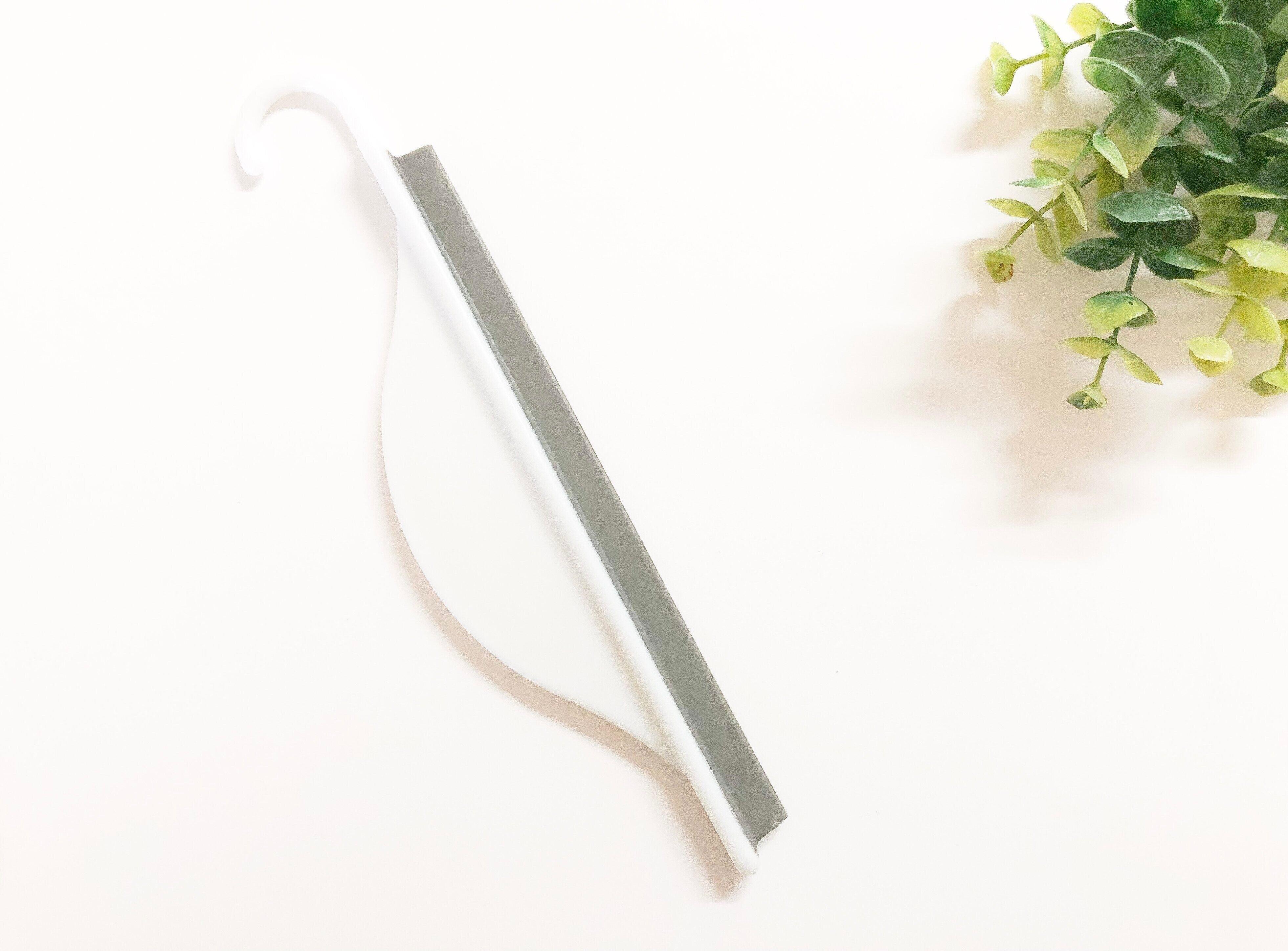持ち手の部分の片側が、タオルバーに掛けられるようなっています。薄くてゴムの部分は約16cmというコンパクトなサイズなので、手の力が伝わりやすく、鏡はもちろん小物などのお掃除もしやすくなっています。