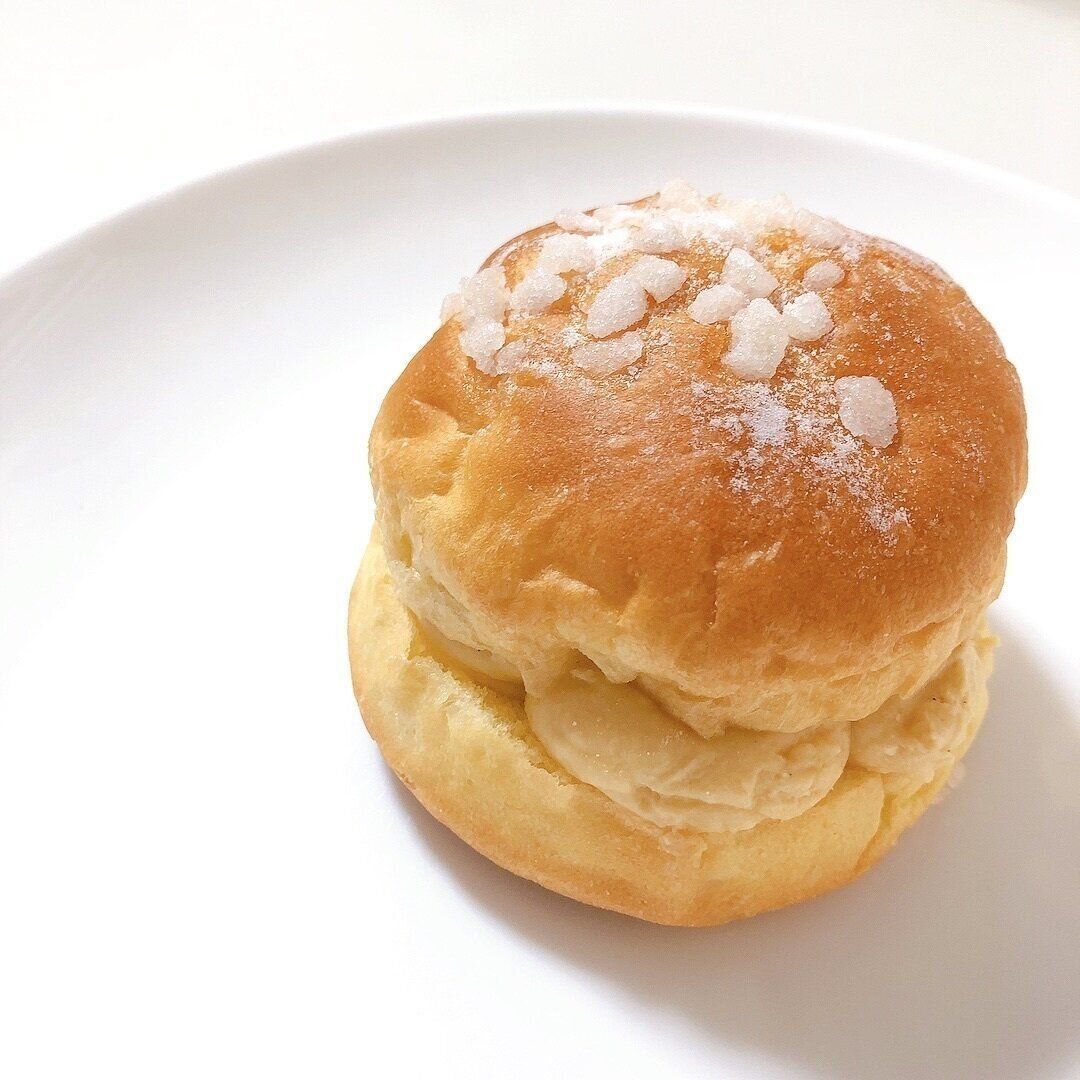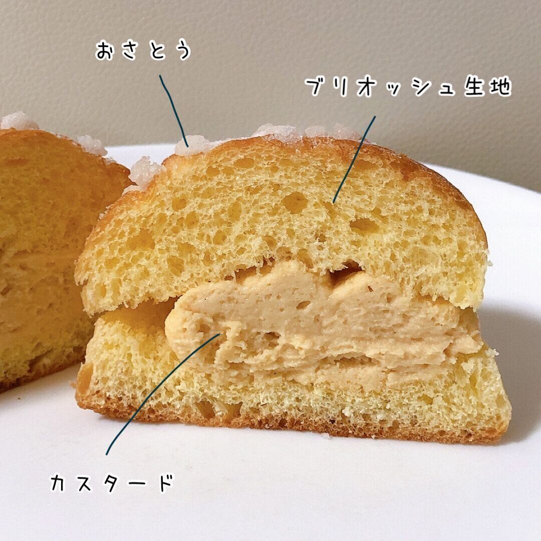 ボリュームのあるブリオッシュ生地の間から、ナチュラルな色合いのカスタードクリームが顔をのぞかせています。天面には、固めてコロっとさせた砂糖がおしゃれにのっています。