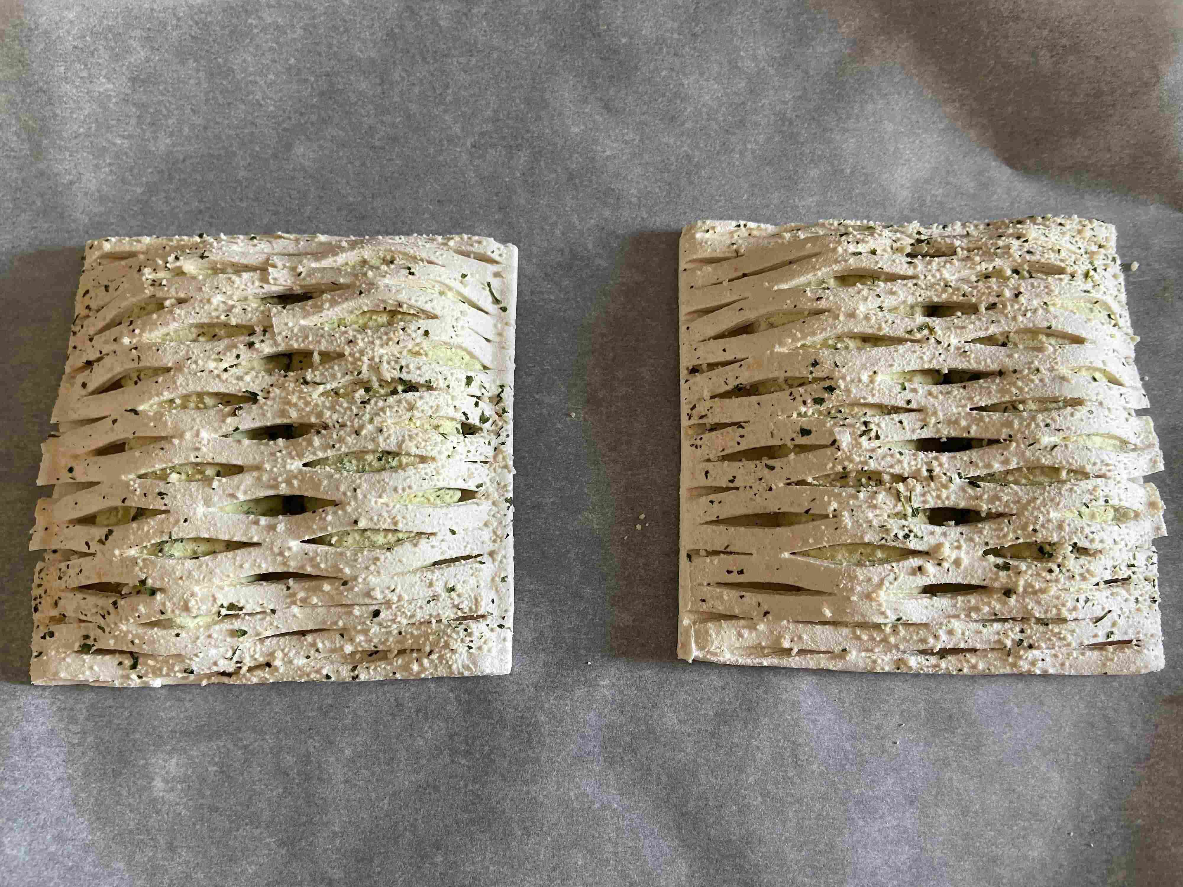 カットしてみるとチェダーチーズとほうれん草のフィリングがたっぷり入っていて、オーブンで焼いたのでアツアツでとろりとしています。