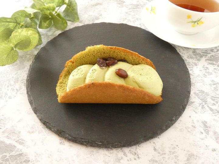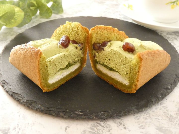 取り出すだけでつぶれてしまいそうなくらいふわっふわの生地は抹茶味。抹茶ホイップクリームと濃厚抹茶チョコペースト、北海道産生クリームをブレンドしたクリームが包まれていて、上にはかのこ小豆がトッピングしてあります。