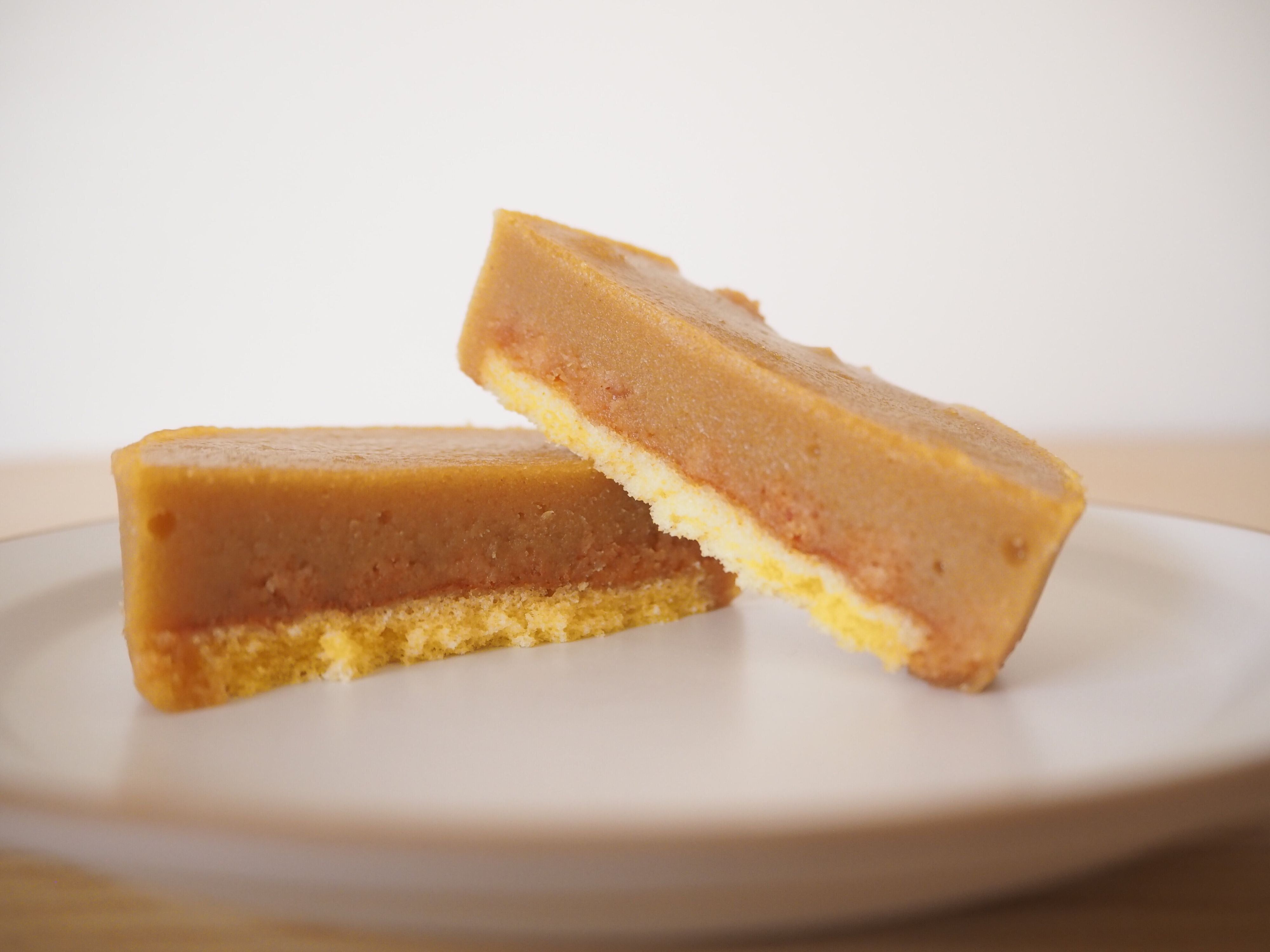 これまたスイートポテトといえば、サツマイモの形をしていることが多いですが、こちらの商品はきれいな円盤形。表面はキャラメル色で、商品名を知らなかったら、何のスイーツかわからなそうです。