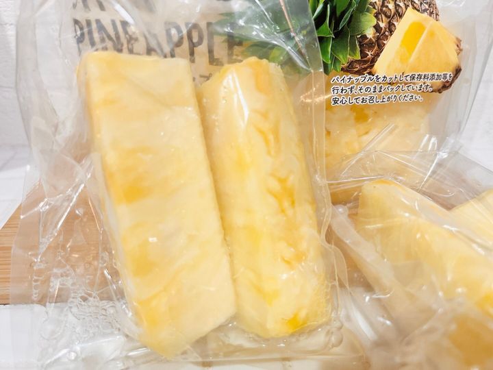 葉付きのパイナップルはたまに購入していましたが、葉をカットして、皮をむいて、芯を抜いてと、工程がありますが、こちらはそのまま食べられるのでとっても便利!!