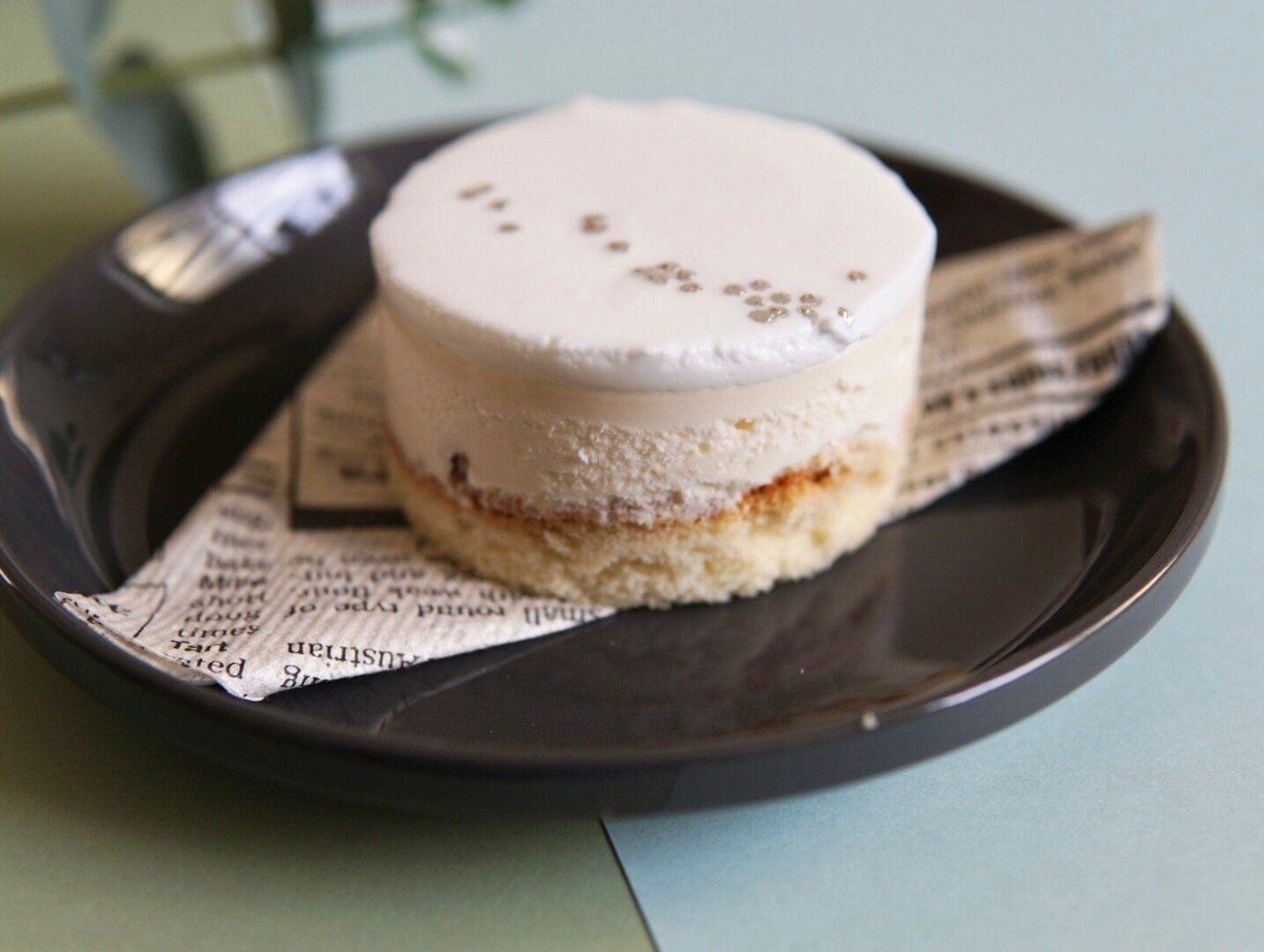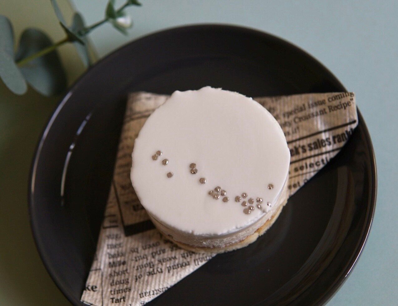 上から見ると、雪のように真っ白なクリームにアラザンの銀色が映えて、シンプルながら美しいです。横から見ると、上のクリームがまっ白で、下がスポンジの黄色、その間にはクリーム色のバニラムースと三層に見えます。