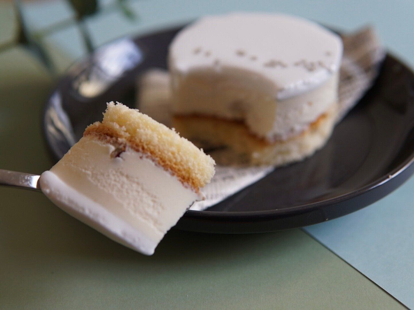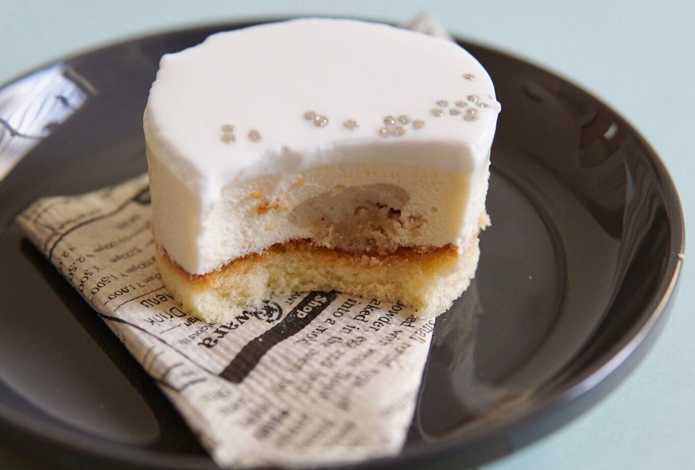 顔を近づけるとバニラのいい匂いがします。上のクリームはフィルムをはがすときにも気を付けないと崩れてしまいそうなくらいふわっふわ。ムースは甘さ控えめでプルプルとした食感。上からスプーンを差し入れたときに引っかかるクッキーナッツのザクッとした食感、バニラガナッシュの濃厚なバニラ感、下のスポンジがあることでたくさんの食感がまとめられ、ケーキ感が感じられます。