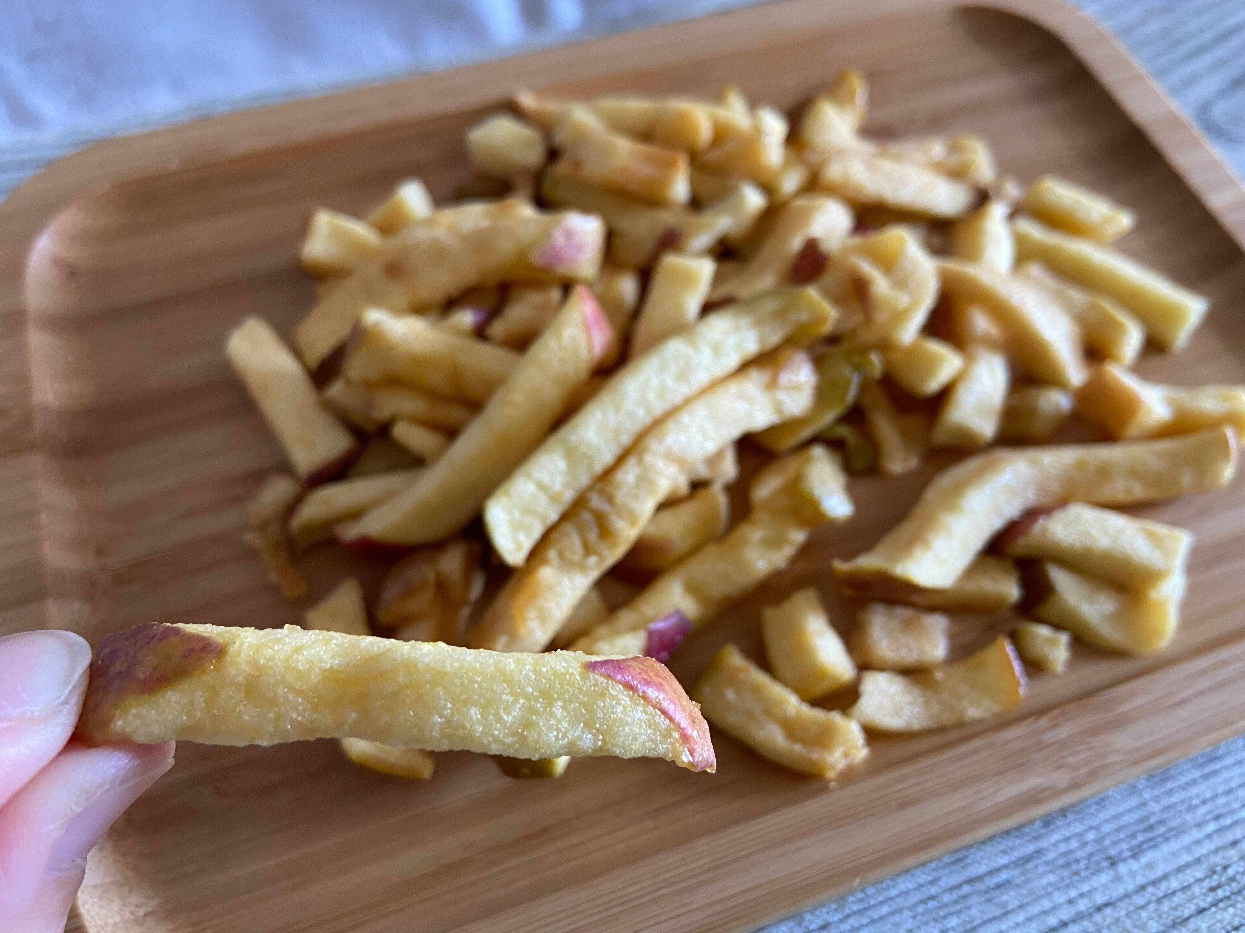 さっそく食べてみると、とっても軽い食感にまず驚きました。水あめが薄くコーティングされていて周りはカリッとしていて中はサクサク。りんごの爽やかな甘酸っぱさで手が止まらないおいしさです。