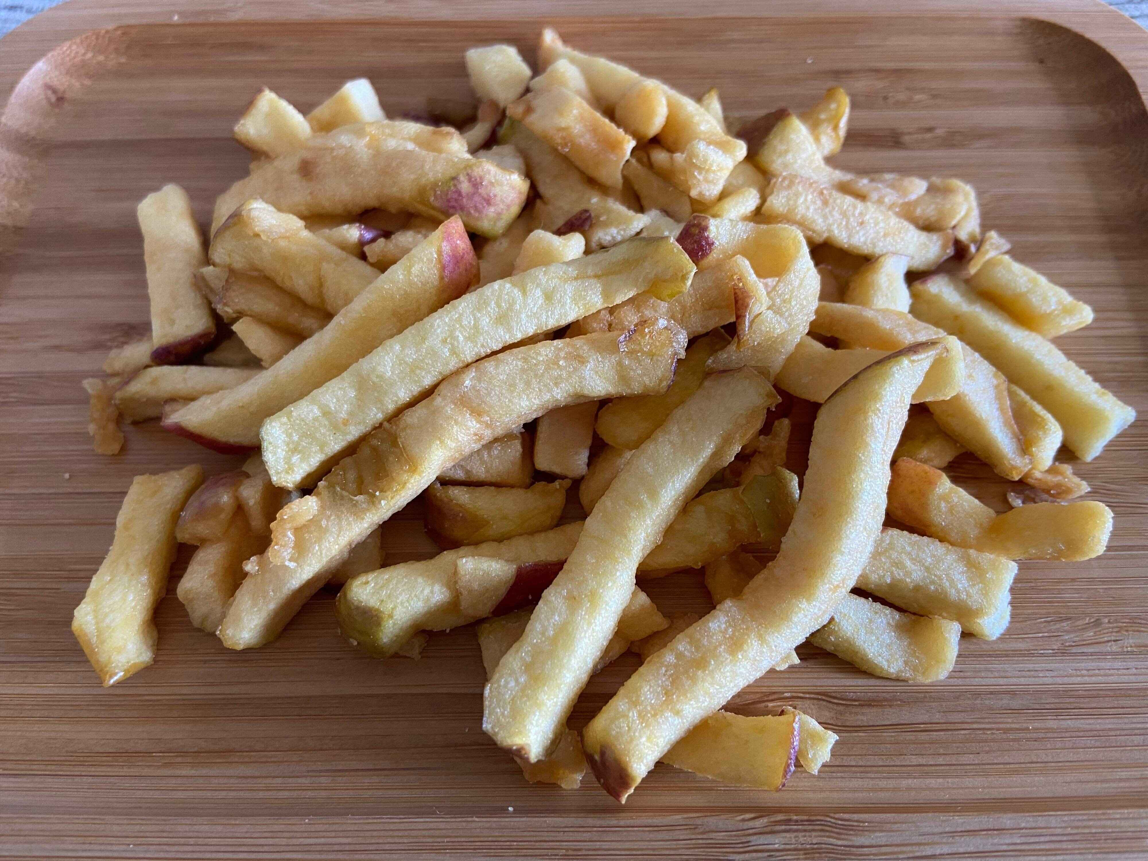 りんごをスティック状にカットして水あめに浸し、低温真空でフライ調理。目指したのは「乾いた生りんご」とのこと。