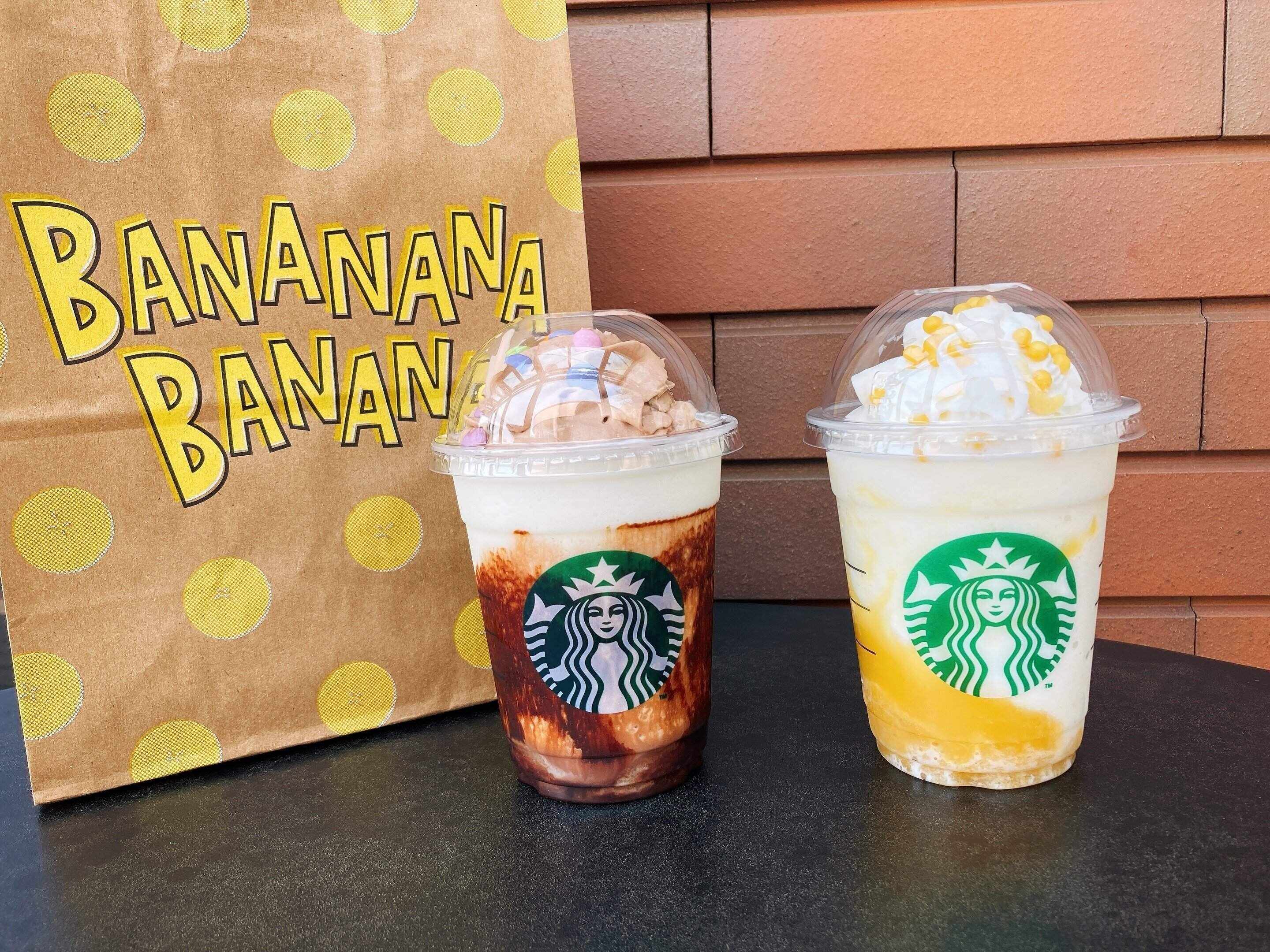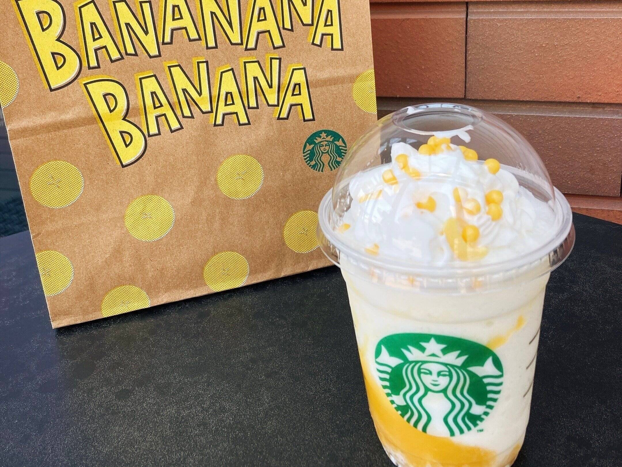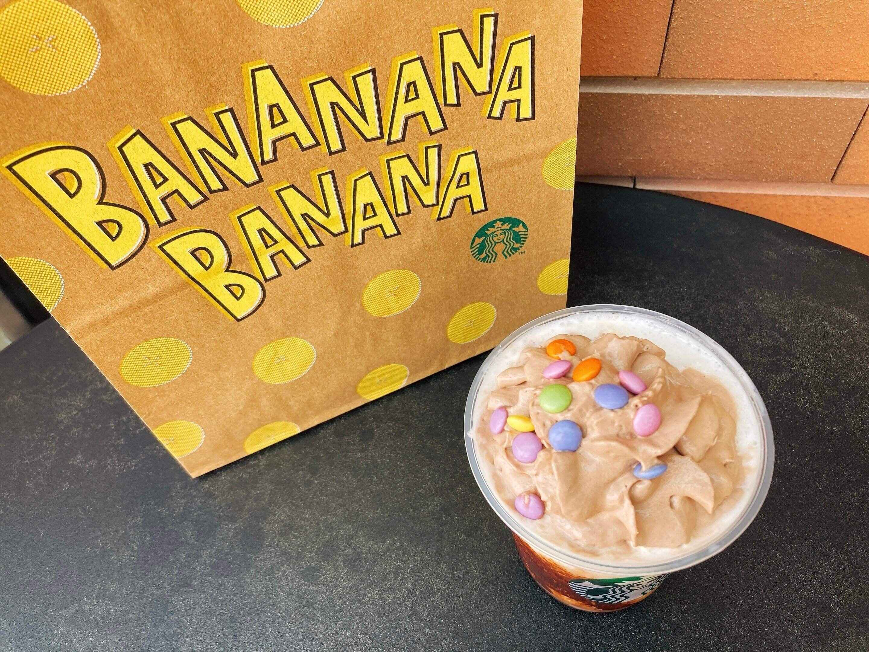 4月13日から新しいフラペチーノ2種類、新しいフード、グッズが発売されました。にっこり笑った口元を思わせるバナナがテーマで、なんと!紙袋にも登場しています。
