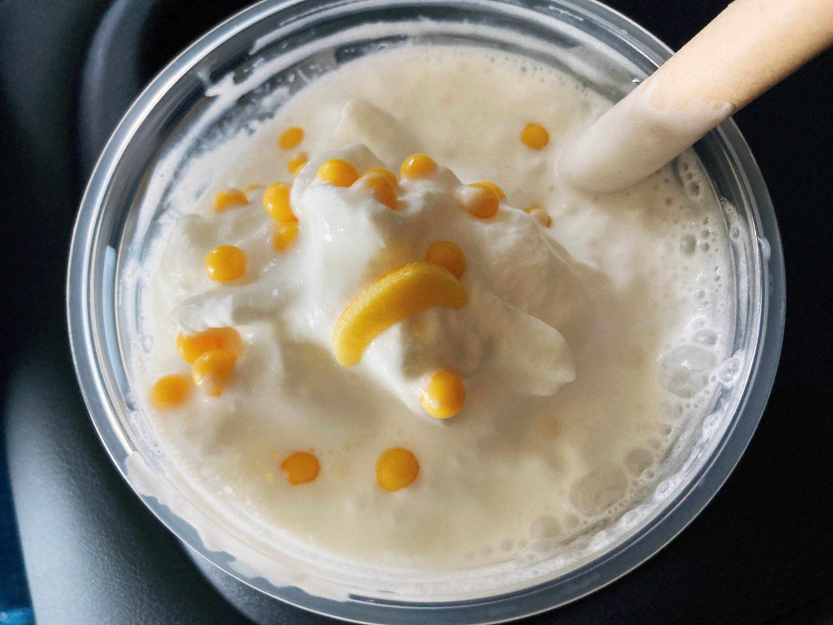 ホイップクリームの上には黄色い小さな玉状のバナナチョコレートがトッピングされています。バナナとミルクが合わさって、クリーミーでさわやかな味わいです。
