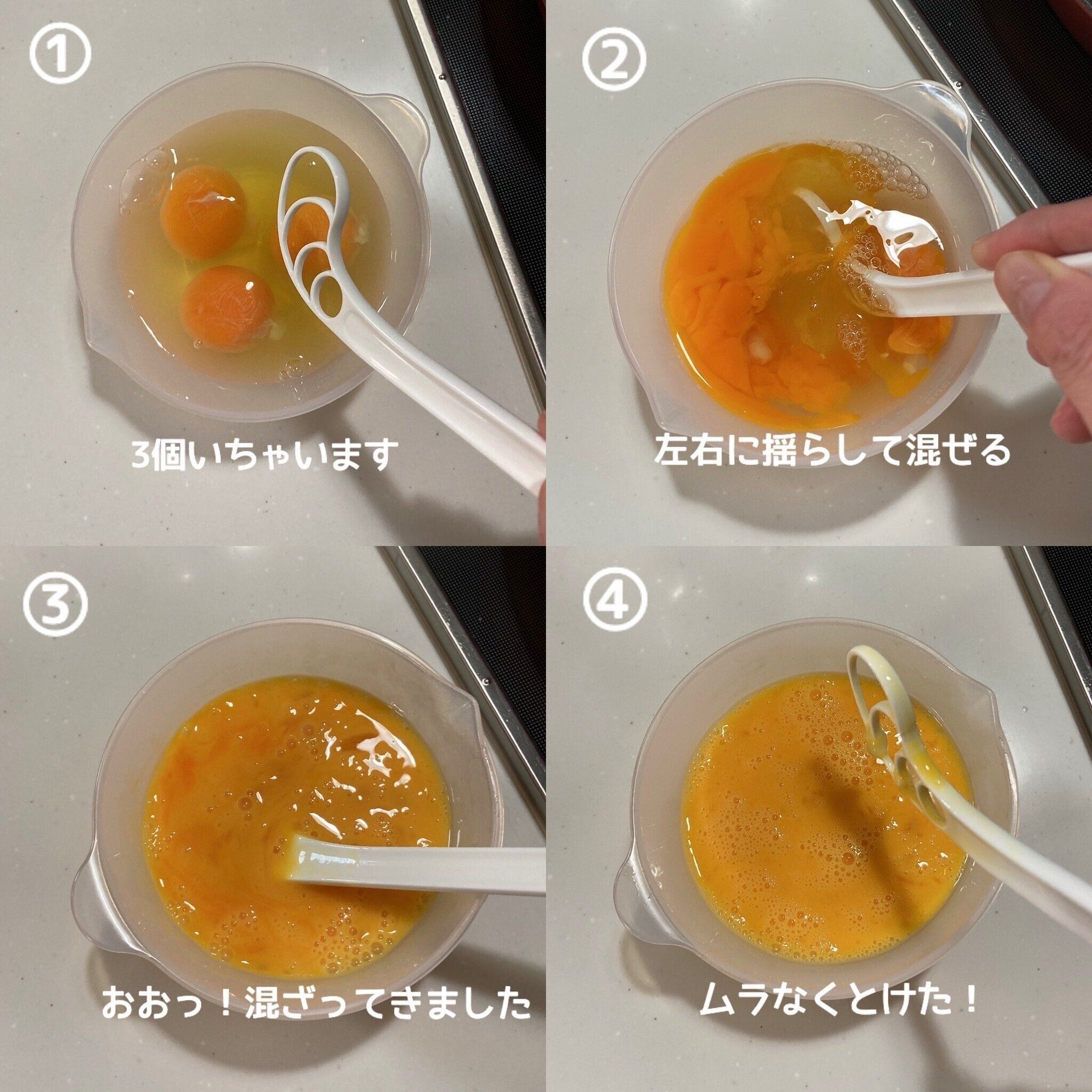 使い方はとっても簡単。左右に揺らすだけ。4つの穴を通って混ざり合うのであっという間に白身と黄身が一体化。お箸で混ぜると白身が混ざりにくいけれど、このキッチングッズを使うとムラなくとくことができます。