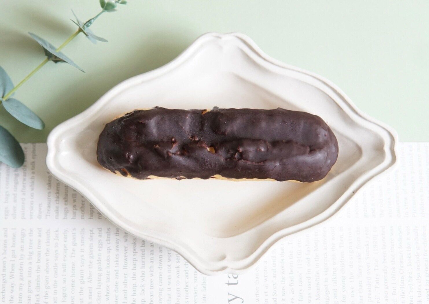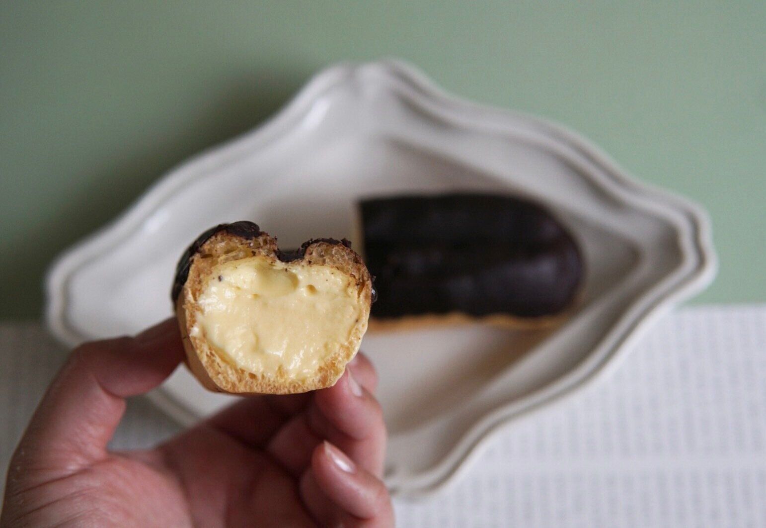 一口食べて驚いたのが、エクレアではどうしても存在感を持っていかれがちなほろにがチョコにカスタードの味が負けていないこと。しっかりと卵の風味が感じられ、カスタードの甘みも、そしてチョコの味もしっかりと立っています。とはいえ、口の中で存在を主張しあうような感じでもなく、良い具合に馴染んでいる、控えめに言って最高なエクレアです。
