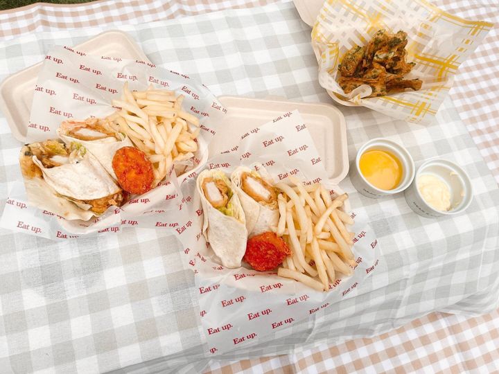 白ベースに赤ロゴで「Eat up」と書かれた柄と、白ベースに黄色と白のチェック柄のタイプの2種類あります。