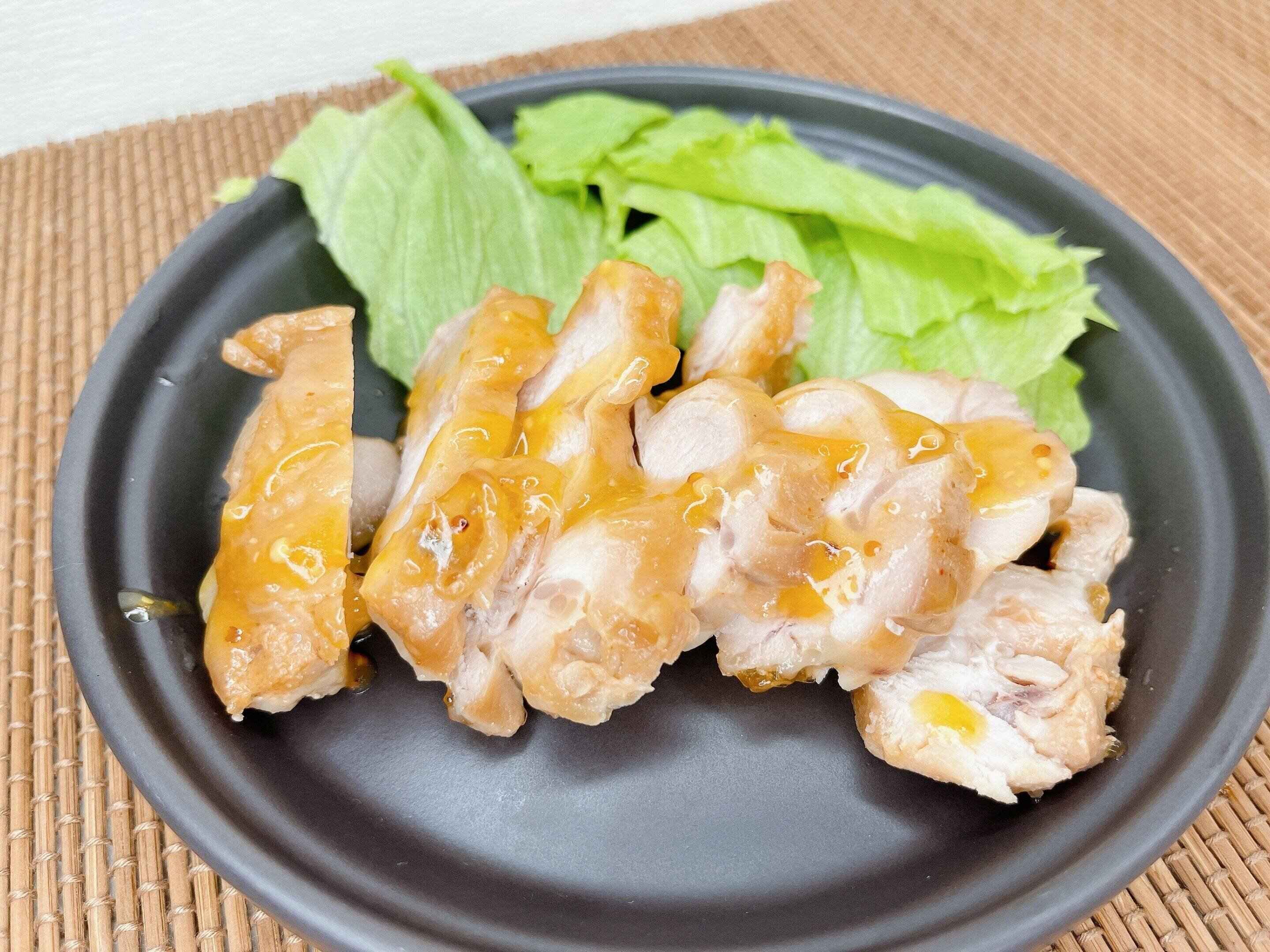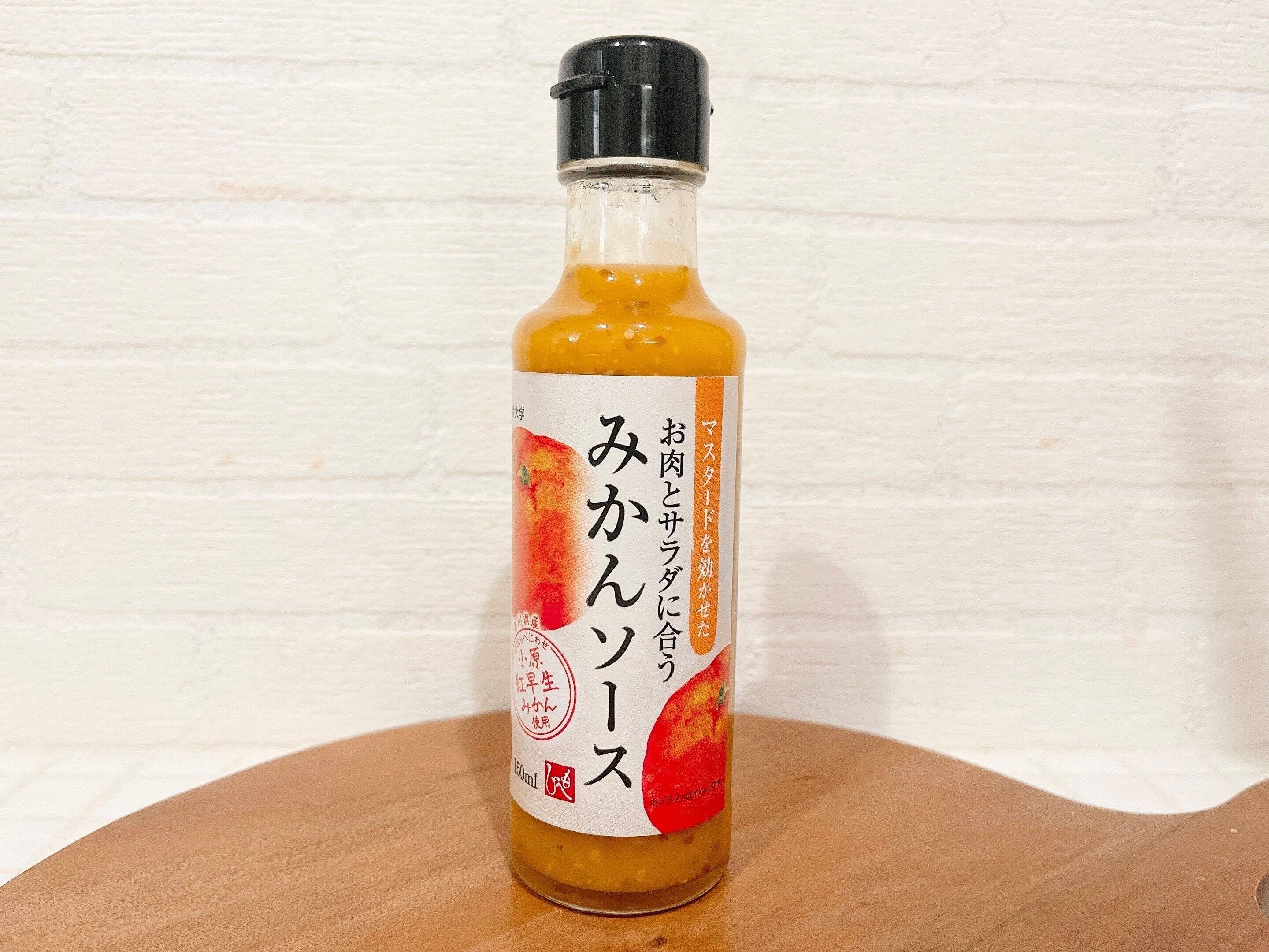 マスタードを効かせた温州みかんソースで、温州みかんストレート果汁を40%以上使用しています。醤油と蜂蜜がベースで、隠し味に塩麹が加わって味に深さを加えているそうです。