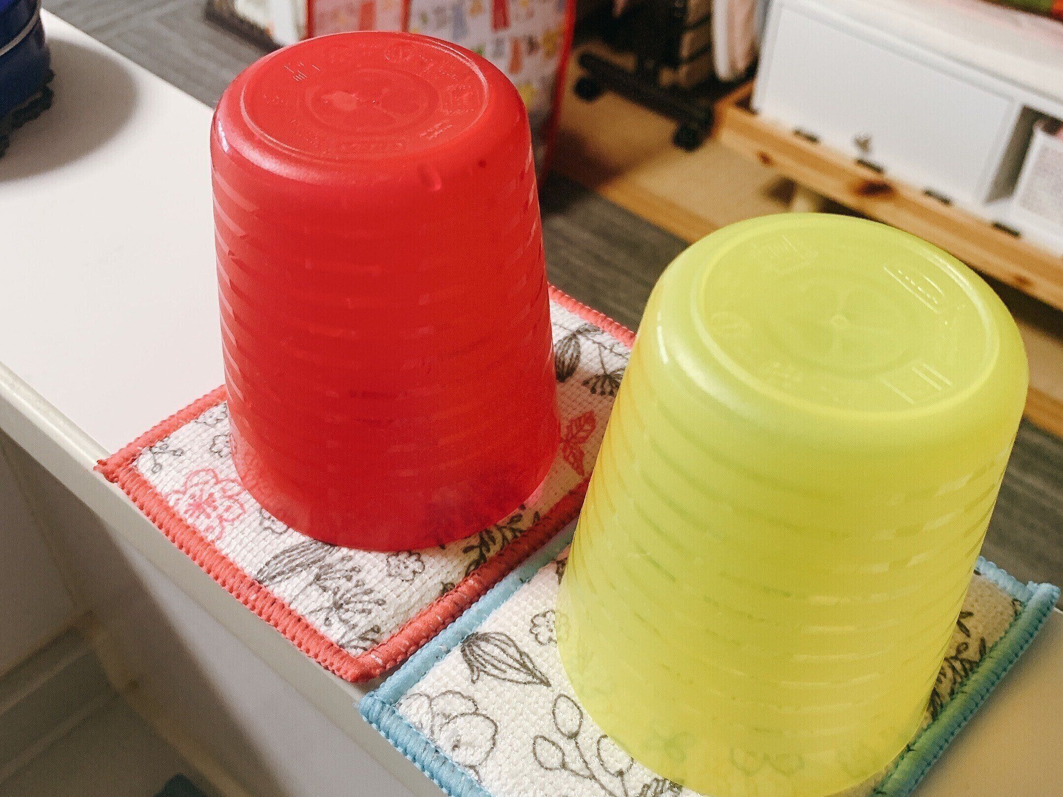 我が家では、子どものコップ置きや歯の矯正用の器具を置いています。子どもはすぐにビチャビチャに濡れたままあちこちに置くので、あとから拭くのも大変です。このマイクロファイバーキッチンスポンジがあれば、ここに置くという目印にもなり便利です。汚れたらそのまま洗濯機で丸洗い。衛生的にも安心です。ただ、乾燥機にかけるとよれやすくなったりするので、自然乾燥させましょう。