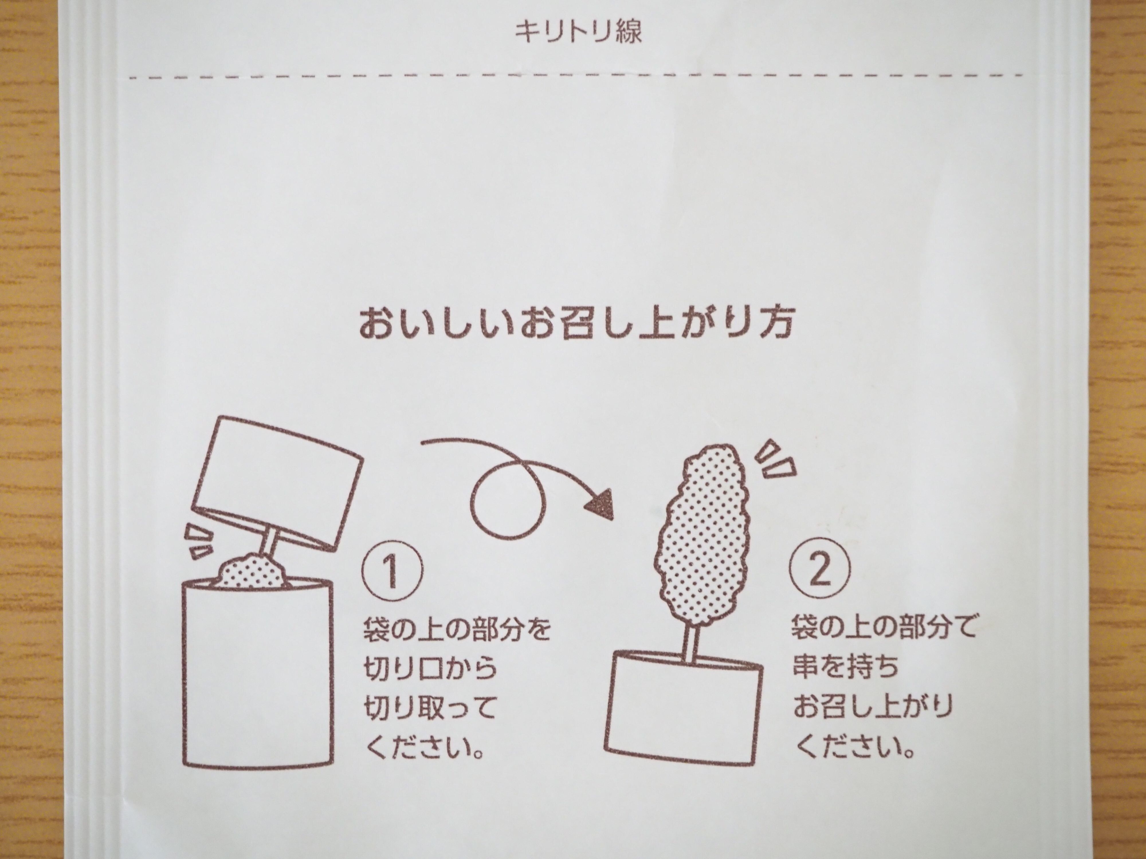 紙の袋には横にキリトリ線が入っています。ここから切り取れば、紙越しに串をつかめるので、手を汚さずに済むという便利な仕様。