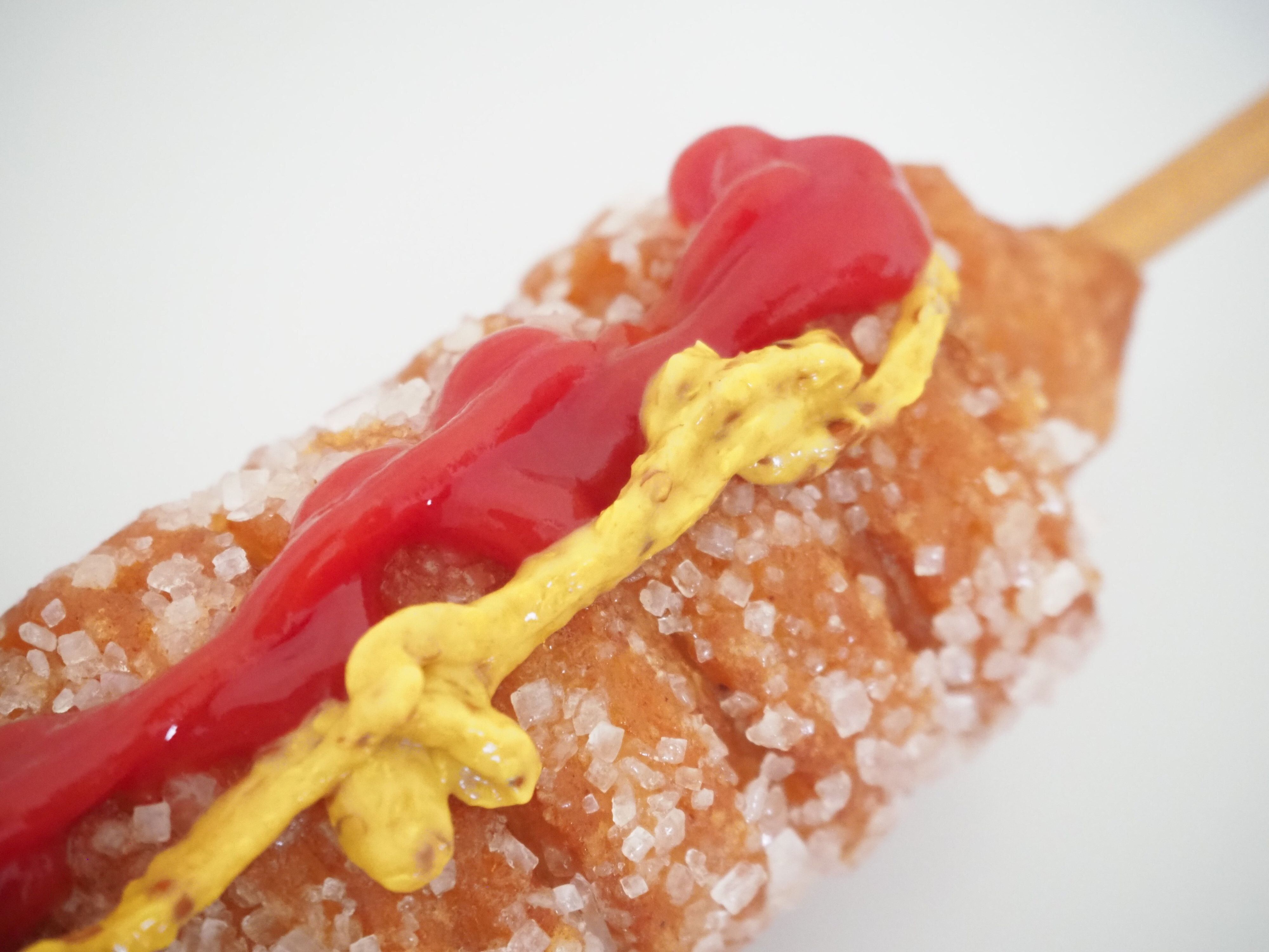 一般的なアメリカンドッグはソーセージに衣を付けて揚げますが、こちらは付けるというより巻いているよう。そのため、表面がリング上でデコボコしています。