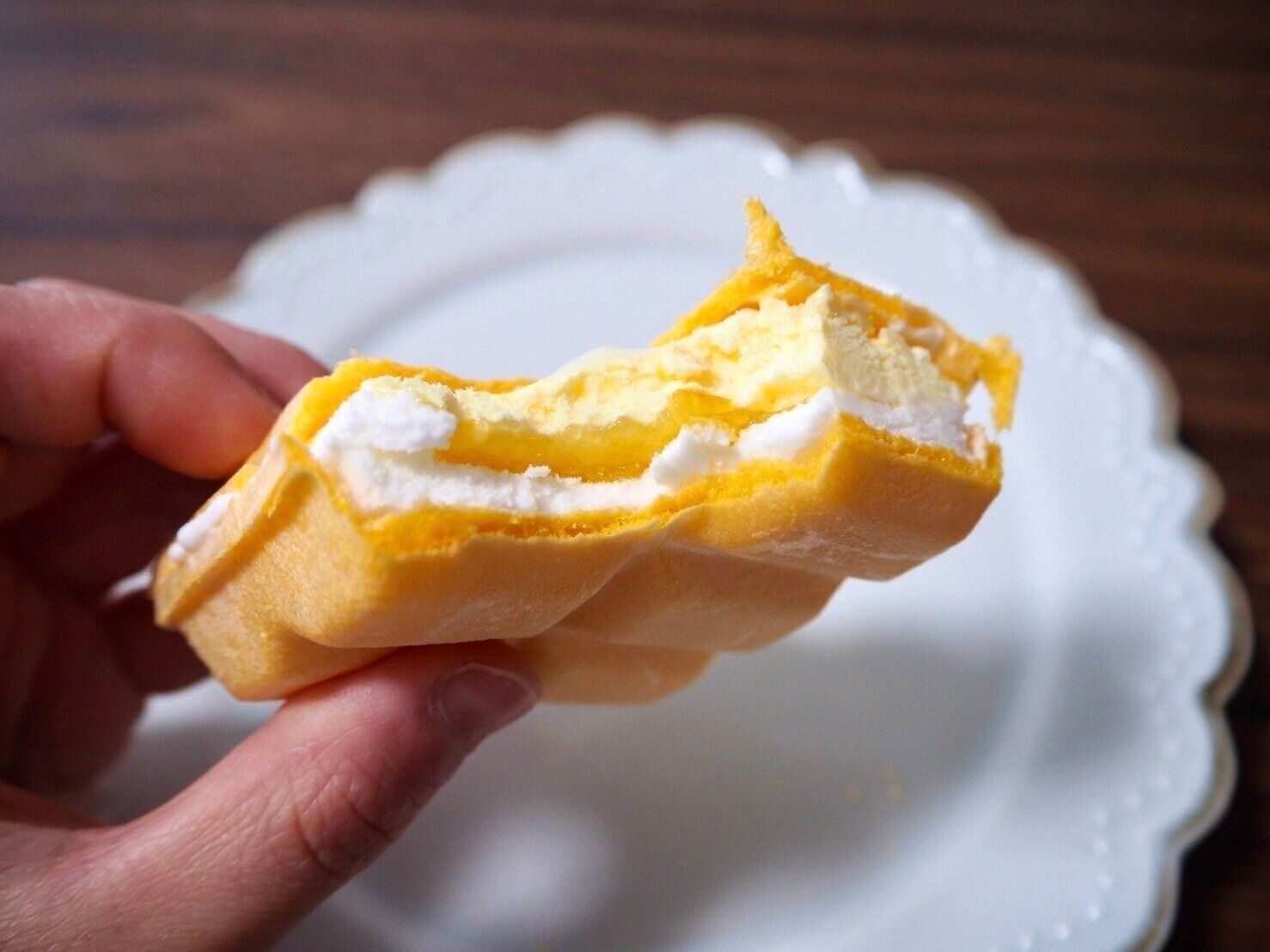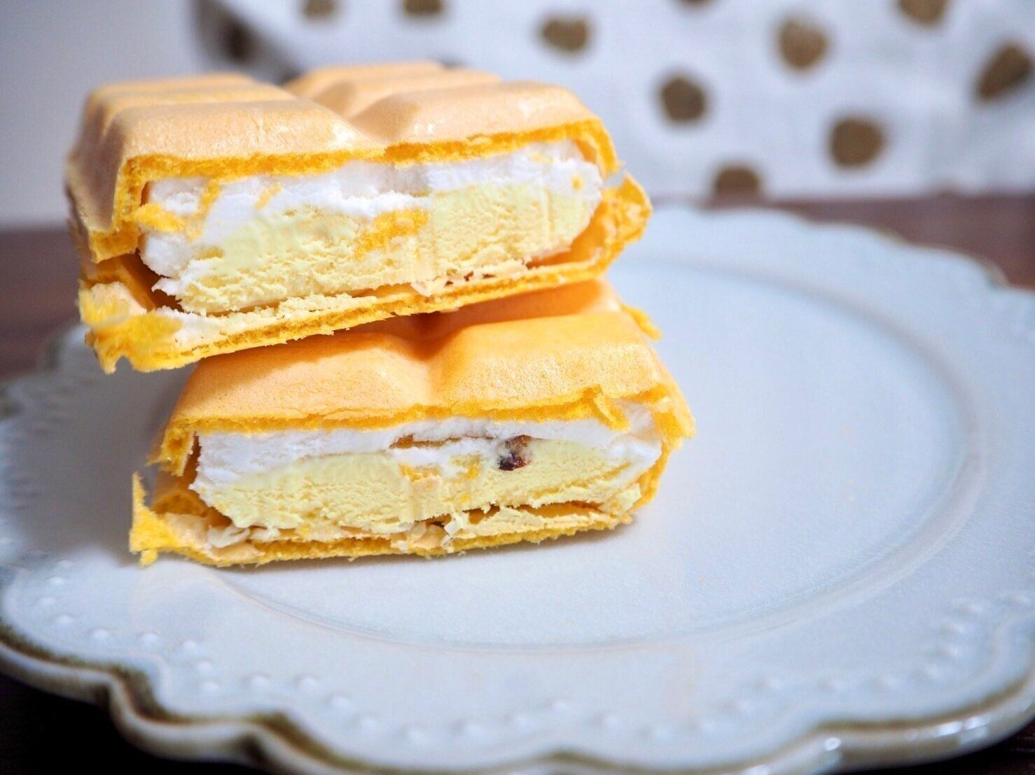 少々オレンジがかったモナカの中は多層構造になっており、アイスはクリームチーズアイスとローストアーモンド入りのレモンカスタードアイスの2種類。